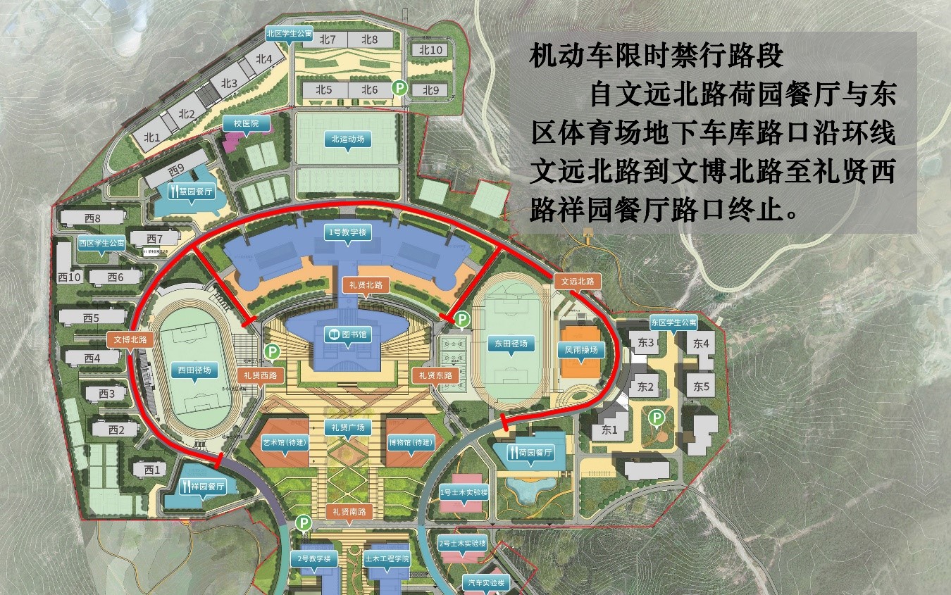 请广大师生自觉遵守限行规定,需驾乘机动车的,提前安排好出行计划,在教学区域上课通行的车辆注意低速行驶,谨慎驾驶。限行时段内违规驶入上述路段的车辆,学校管理部门将依规处置。