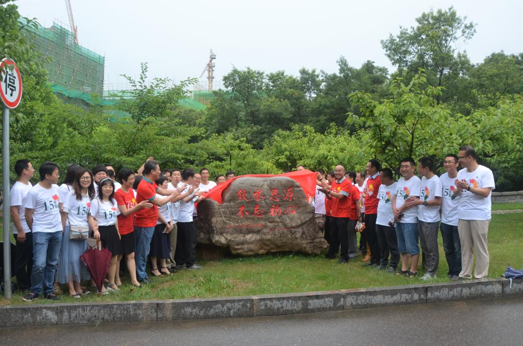 下午,校友们陆续到校,或校园赏景,或回忆当年。三点,纪念石揭幕仪式正式开始,陈为公主持仪式。朦朦细雨并不能消减校友们的热情,大家围绕纪念石而站,共同为纪念石揭开“红盖头”,随着幕布的落下,刻有“饮水思源,不忘初心”的纪念石展现在大家面前,展示着校友们对学校、学院的感恩和怀念。