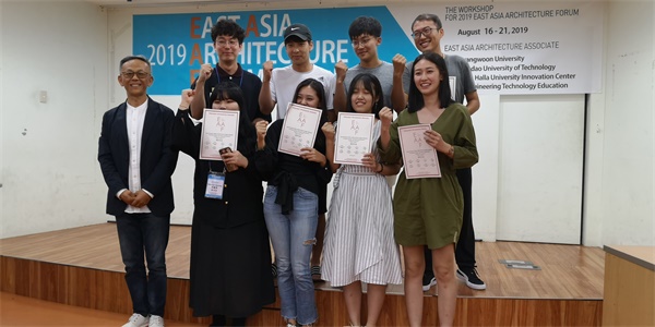 8月20日,本次联合设计工作营闭幕式如期举行,韩国光云大学金真模、青岛理工大学郝赤彪等教授为联合设计营成员进行颁奖。郝赤彪为本次联合设计营作了总结发言,他指出,他惊喜于同学们在如此短的周期中达到了令人满意的成果,每个小组都有不错的切入点,但由于对济州岛的了解欠缺,同学们的设计方案还需要改进,而同学们在这次工作营中相互交流,提升思维,发掘创造力的成长过程是最珍贵的。最终,边坤、于洽卿等同学所在的Team6获得了2019第九届EAAF中韩联合设计的一等奖。