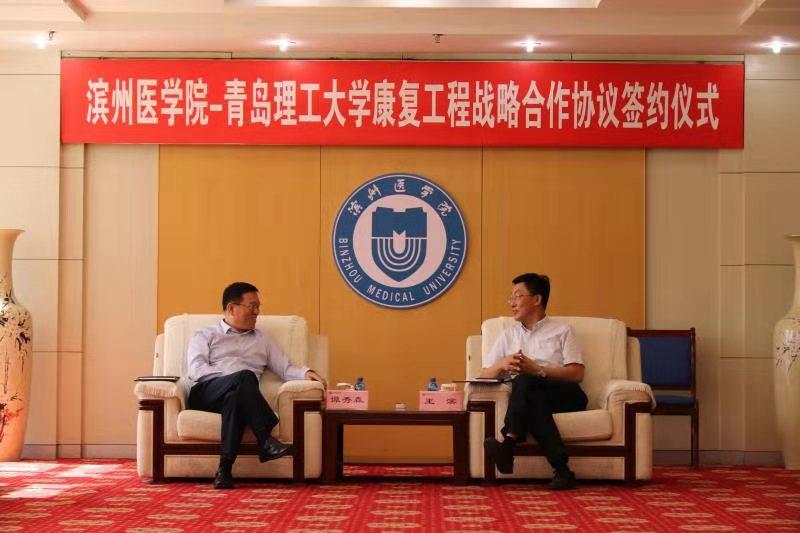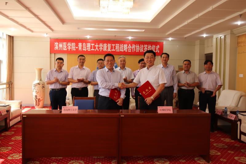 谭秀森校长与王滨院长在滨州医学院共同签署了《滨州医学院-青岛理工大学康复工程研究院战略合作框架协议》,双方建立以康复工程研究为主要内容的战略合作关系,以推动国家康复工程事业发展为目标,发挥双方各自的优势学科力量,重点研究医工融合的医养健康领域应用技术研发,共同致力于推动康复工程临床研究、材料研究、转化应用研究、3D打印辅具等研发水平的提升,着力开展康复工程应用研究、产品开发、成果转化、学术交流及人才培养,努力为促进中国康复工程事业发展、为健康中国建设做出积极贡献。