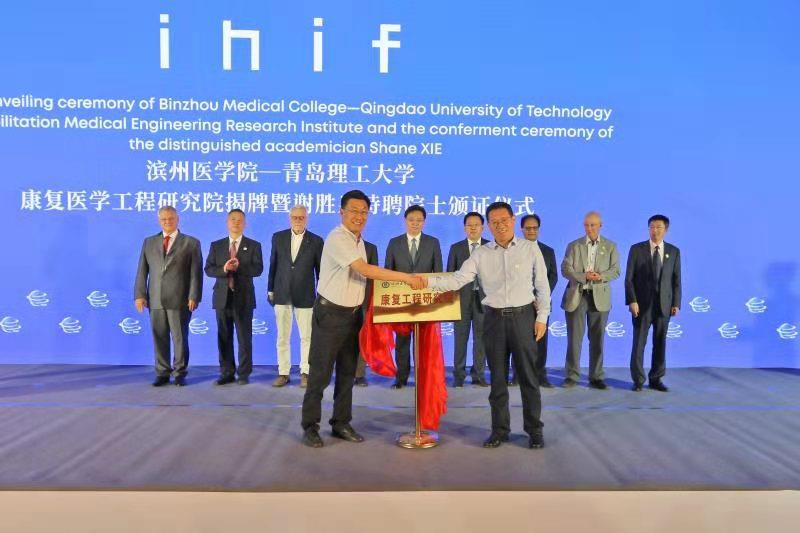 在烟台市委副书记、市长陈飞,副市长张代令及7位国际知名院士的见证下,校长谭秀森和滨州医学院院长王滨共同为青岛理工大学-滨州医学院康复工程研究院揭牌,王滨向新西兰皇家工程院院士谢胜泉教授颁发了康复工程研究院院长、特聘教授聘书。