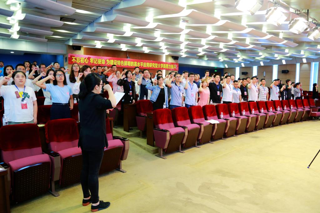 结业典礼开始前举行了新教师入职宣誓仪式。全体新教师庄严宣誓,忠诚党的教育事业,履行教师神圣职责,立德树人,为人师表,弘扬理工精神,争做“有理想信念、有道德情操、有扎实学识、有仁爱之心”的好老师,为学校的改革发展,为社会的文明进步,为中华民族的伟大复兴,奉献全部智慧和力量。人事处副处长、教师发展中心主任吕楠领誓。