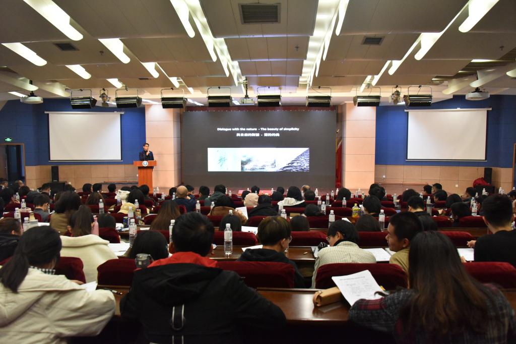 杨朝闵先生以《与自然的对话·简约的美》为题进行了分享。杨朝闵曾于极简主义风格缔造者、安缦酒店御用建筑师 Kerry Hill 先生的“科瑞希尔国际建筑设计事务所”担任建筑师,并在此期间成为青岛涵碧楼项目驻中国的建筑师及项目设计方代表,众多国际项目的历练,使他对酒店设计、自然设计更有了一份独特的理解。他从“与自然的对话”的角度切入,毫无保留地分享了众多精彩的项目案例,并深度剖析了他主导项目的设计思路以及在涵碧楼得工作经历,为同学们带来了真正的设计思考。最后,杨朝闵希望同学们用心体验生活,亲近大自然,在大自然中感受地域文化的魅力。杨朝闵精彩的分享内容带来大家新的思考与交流,并积极与杨朝闵对话,现场学术交流氛围浓厚。