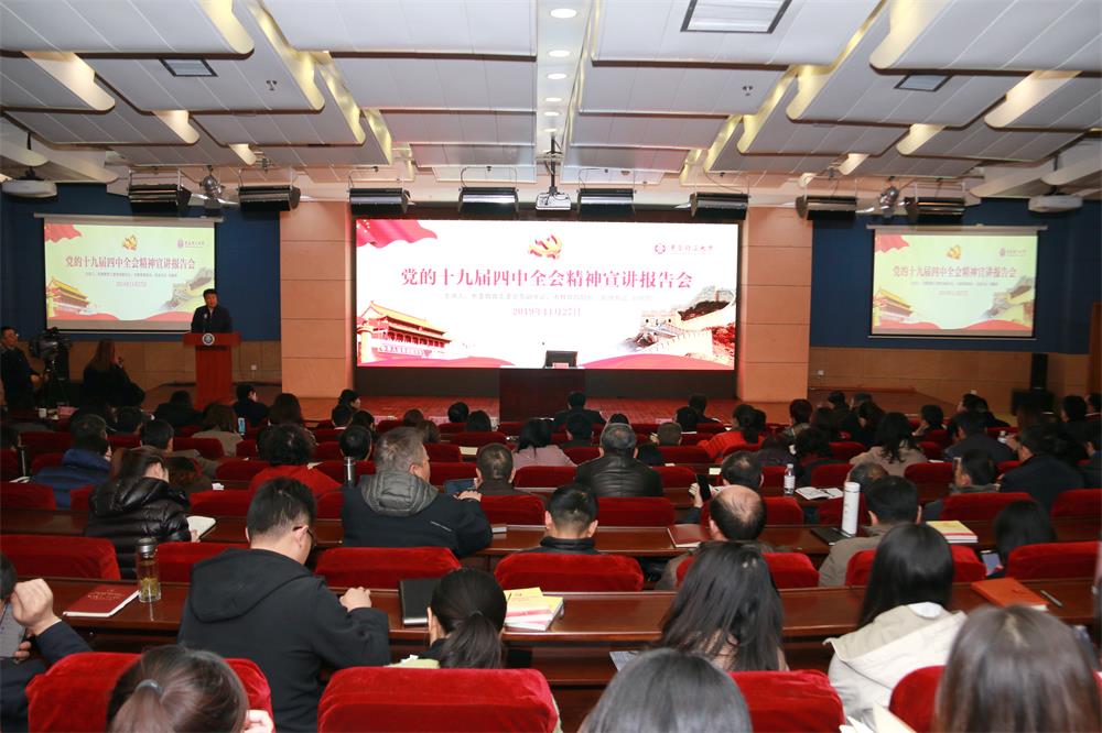 刘鹏照以《坚定制度自信增强行动自觉勇做新时代的奋进者、开拓者、奉献者》为题,从“充分认识坚持和完善中国特色社会主义制度、推进国家治理体系和治理能力现代化的重大意义”“深刻领会中国特色社会主义制度和国家治理体系的显著优势”“准确把握党的十九届四中全会作出的重大决策部署”“全面落实四中全会关于教育的重要内容”四个方面,紧紧围绕学习贯彻习近平新时代中国特色社会主义思想,从深刻领会全会《决定》的重大意义,准确把握中国特色社会主义制度和国家治理体系的科学内涵、基本特征和制度优势,切实坚定制度自信;深刻领会全会部署的目标任务,准确把握坚持和完善中国特色社会主义制度、推进国家治理体系和治理能力现代化的总体要求、总体目标、重点任务和重大举措,切实明确路径和举措;深刻领会全会对做好新时代教育工作提出的新要求,准确把握社会主义先进文化前进方向和社会主义大学的办校规律,切实将社会主义大学的制度优势转化为大学治理的效能,对党的十九届四中全会精神进行了深刻阐释和全面解读。报告主题鲜明、内涵丰富,既有政治高度、理论高度,又有很强的现实性、针对性,对全面准确理解把握全会精神,做好学习宣传贯彻工作,催生推动学校高质量、内涵式发展的强大动力具有重要的指导和推动作用。