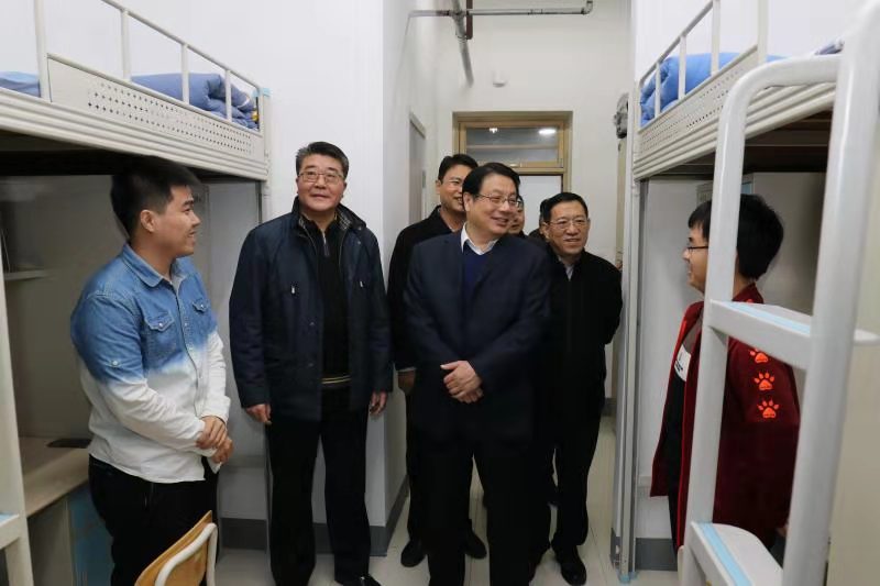 会前,荆戈一行深入校园管理和师生后勤服务保障一线开展了实地调研。在祥园餐厅,察看了教师和学生餐饮保障情况,听取了齐德义关于餐厅托管升级改造及管理运行情况汇报;在北区学生公寓,听取了学生工作处负责人关于学生搬迁入住和公寓文化建设情况汇报,深入学生公寓与学生亲切交流,询问学习生活情况,并勉励青年学子珍惜美好时光和学习生活条件,刻苦钻研、勤奋学习;在学校应急管理指挥中心,察看并听取了保卫处负责人关于应急指挥系统建设与运行情况汇报。