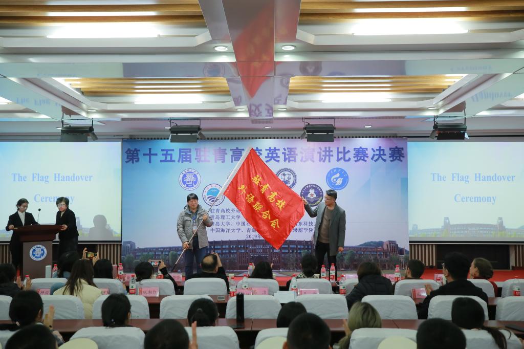 比赛最后,人文与外国语学院党总支副书记王振将会旗交接给下届比赛主办方青岛大学外国语学院,娄永强表示将努力办好2020年的驻青高校英语演讲比赛。