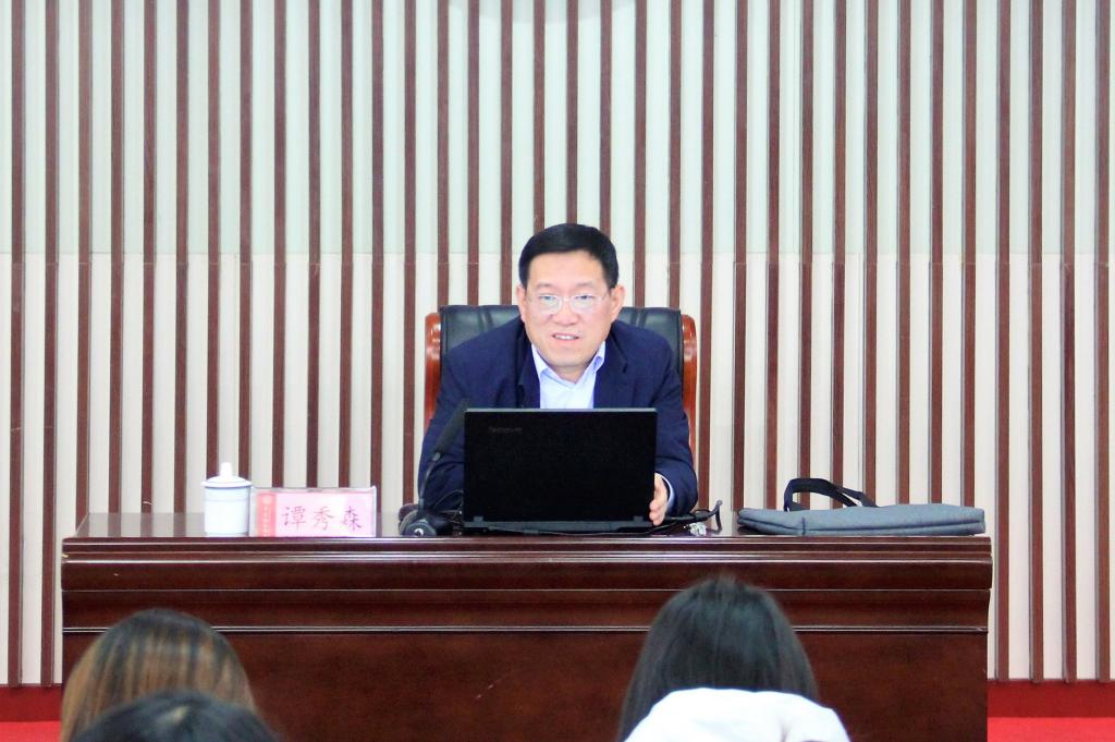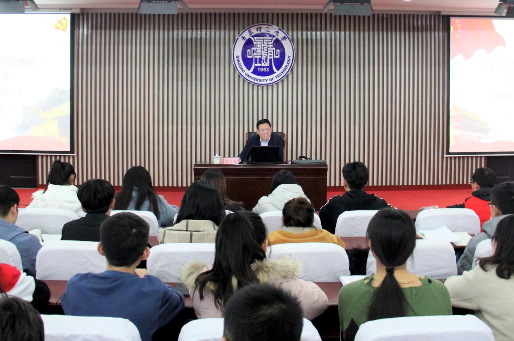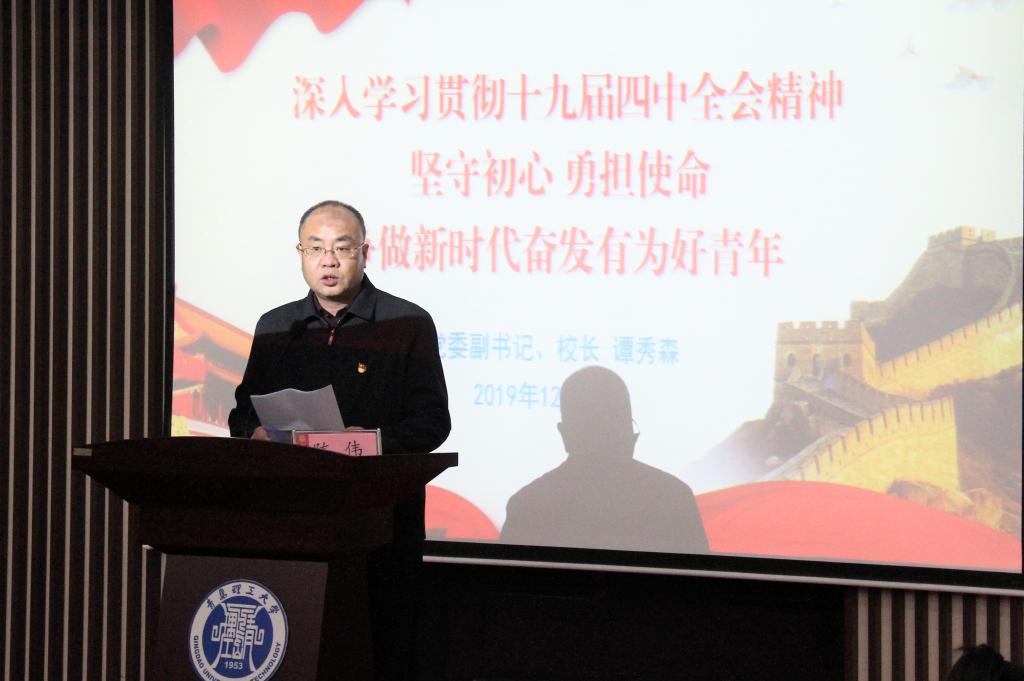 12月12日下午,学校党委副书记、校长谭秀森以《深入学习贯彻十九届四中全会精神,坚守初心,勇担使命,争做新时代奋发有为好青年》为题,在嘉陵江路校区教学楼西报告厅为师生作十九届四中全会精神专题宣讲报告。校党委常委、宣传部部长陈伟主持报告会。学校青马工程培训班学员、校院两级团委专兼职干部、学生工作干部、学生会干部、学生理论社团负责人代表共180余人参加了报告会。