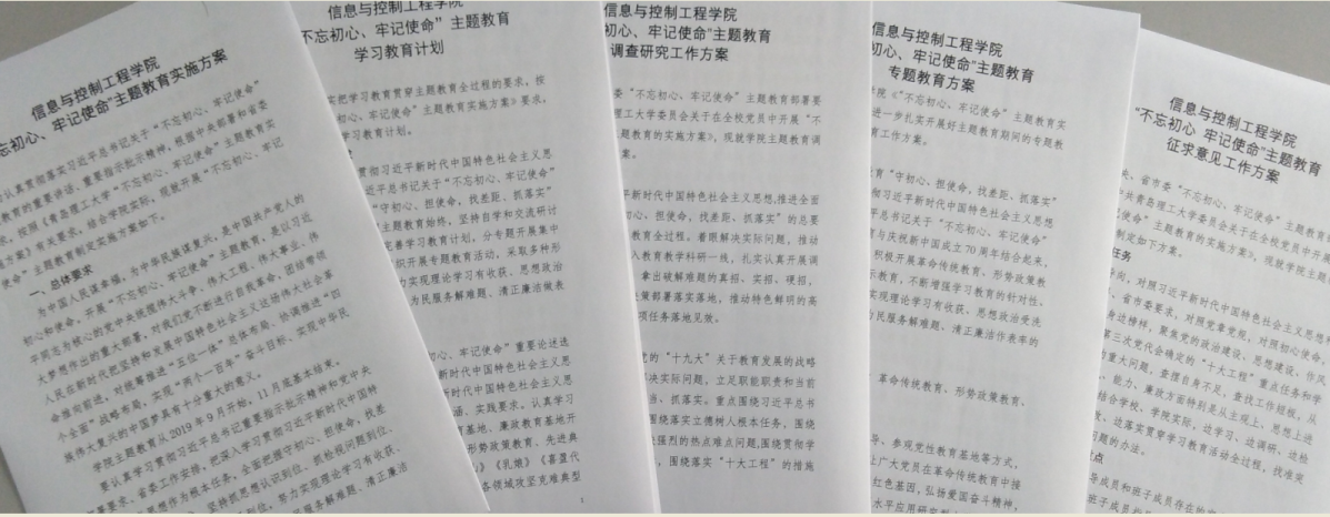 主题教育开展以来,学院认真学习领会《青岛理工大学“不忘初心、牢记使命”主题教育实施方案》,全面把握主题教育的总要求,聚焦初心使命,以高度的政治自觉、思想自觉以及行动自觉,扎扎实实部署好、开展好、落实好“不忘初心、牢记使命”主题教育。结合学院实际,第一时间成立主题教育领导小组,制定了《信息与控制工程学院“不忘初心、牢记使命”主题教育实施方案》、《信息与控制工程学院“不忘初心、牢记使命”主题教育学习教育计划》、《信息与控制工程学院“不忘初心、牢记使命”主题教育调查研究工作方案》、《信息与控制工程学院“不忘初心、牢记使命”主题教育专题教育方案》、《信息与控制工程学院“不忘初心 、牢记使命”主题教育征求意见工作方案》等文件。