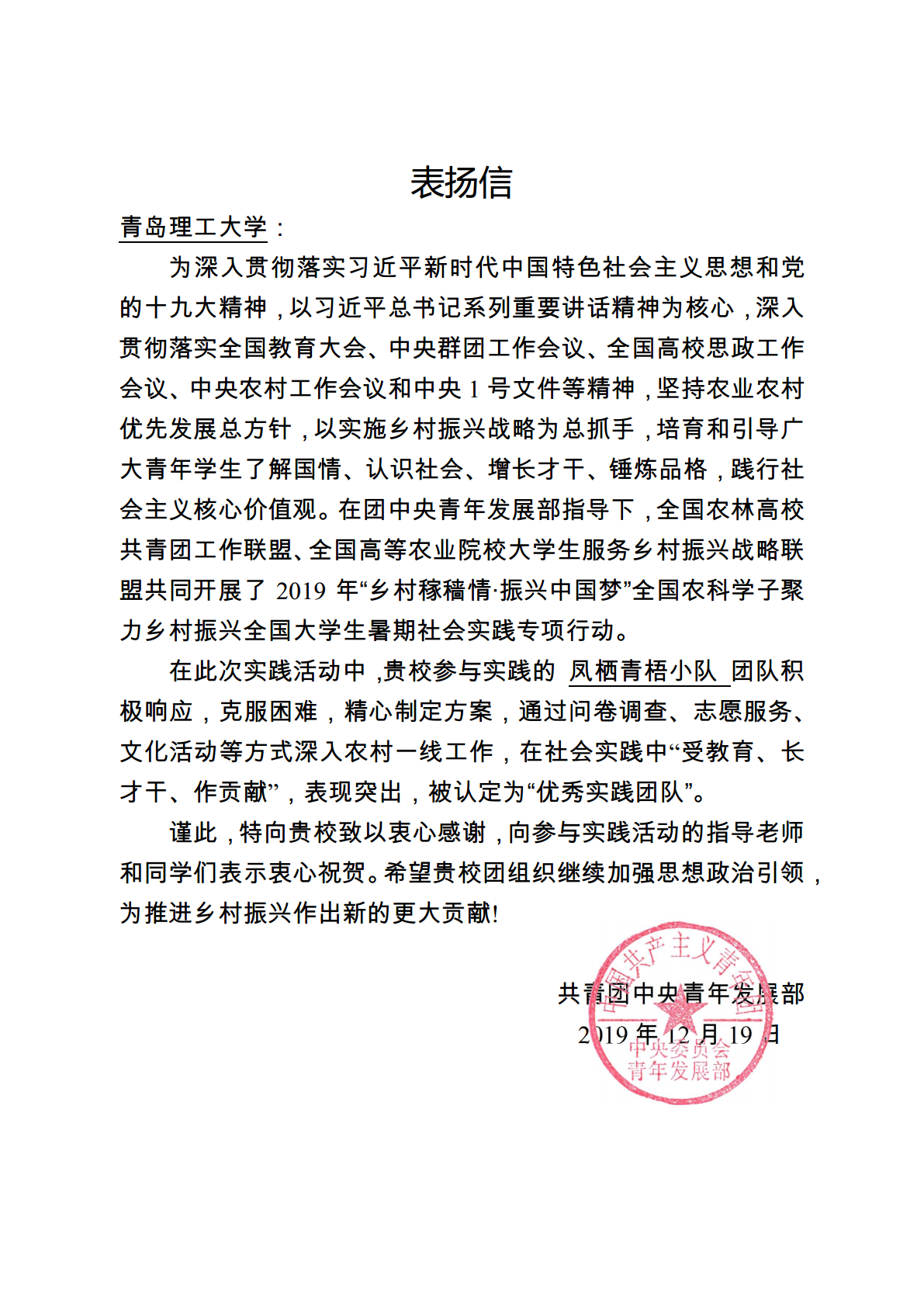 近日,团中央青年发展部向我校发来表扬信,对我校建筑与城乡规划学院在2019年“乡村稼穑情·振兴中国梦”全国大学生暑期社会实践专项行动中表现突出的“凤栖青梧小队”进行书面表扬,将其认定为“优秀实践团队”。团中央高度肯定了该团队在山东省即墨市金口镇凤凰村助力乡村振兴所作出的贡献,对我校积极筹备活动、鼓励学生克服困难、精心制作方案、组织学生深入农村一线工作表示感谢。