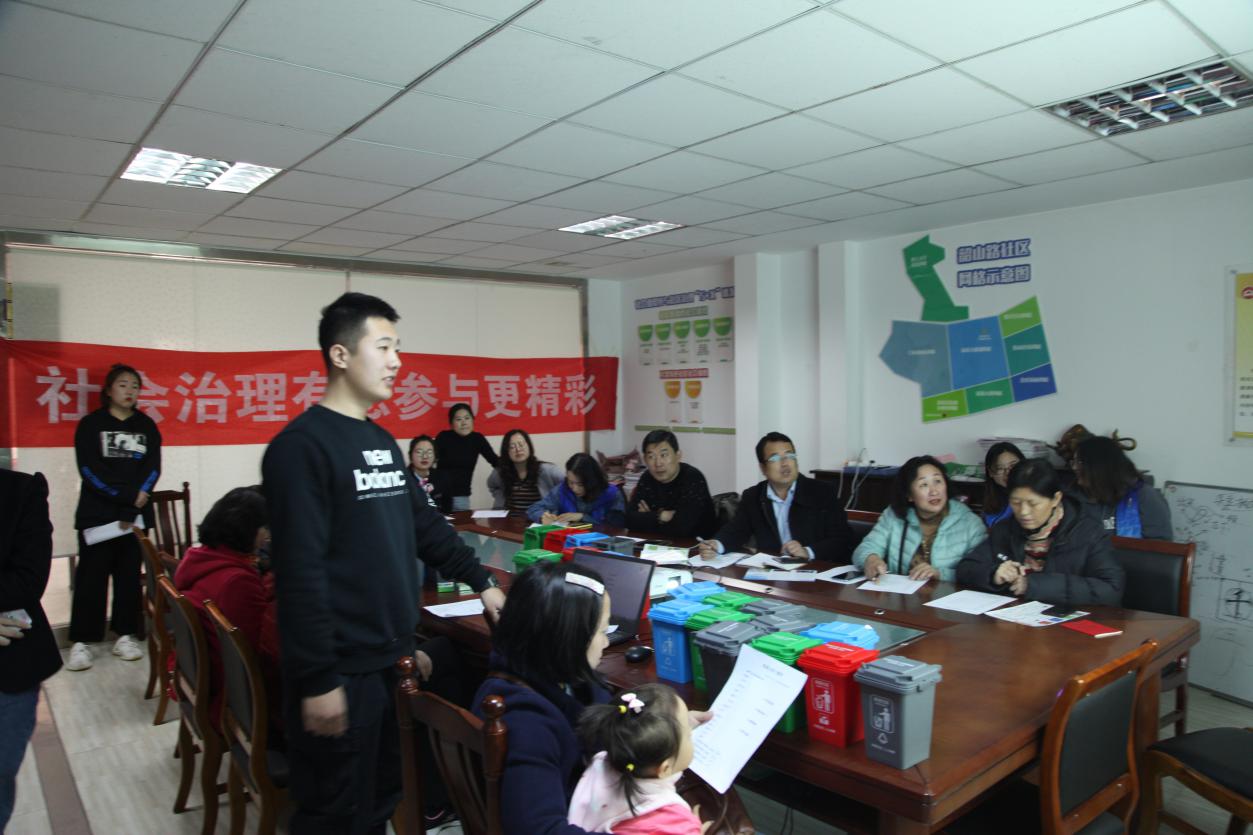 图为商学院学生在社区为社区干部进行垃圾分类制度讲解