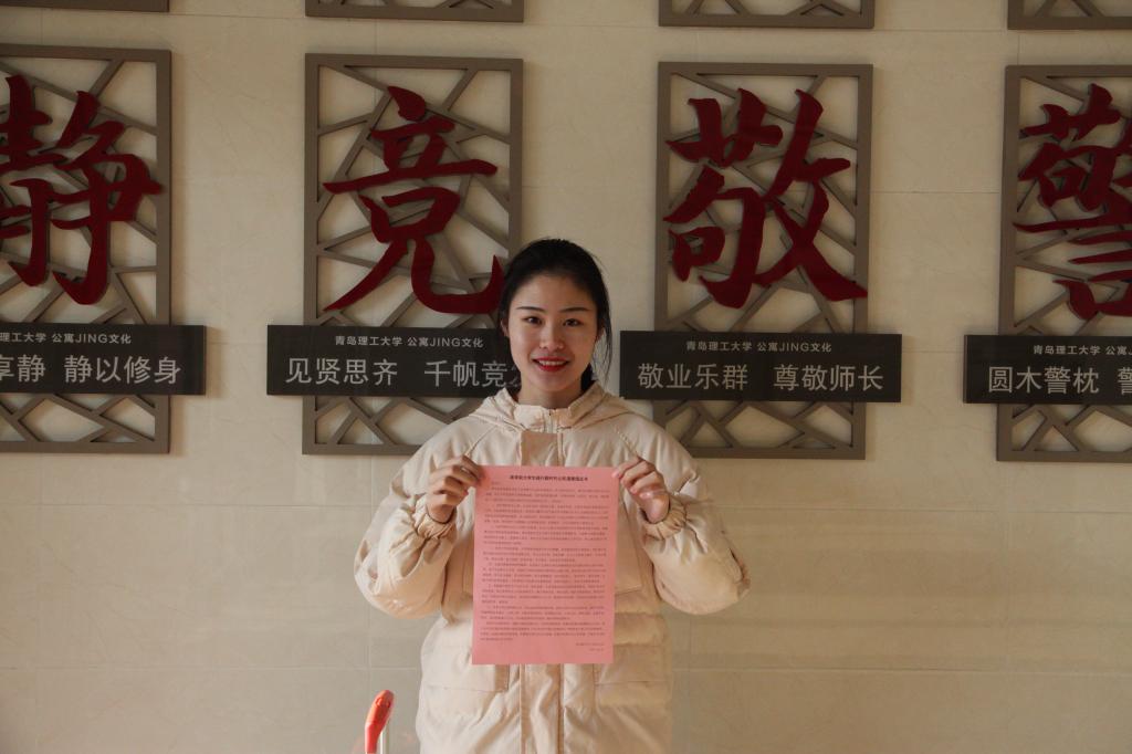 图为黄婷婷即将带着《商学院大学生践行新时代公民道德倡议书》返回家乡哈尔滨