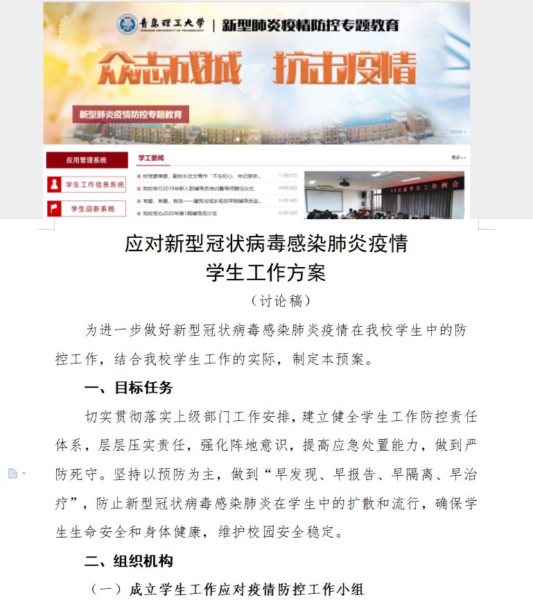 迅速集结,勇担闻令而动的冲锋队。疫情突如其来,学生工作战线迅速吹响集结号角。第一时间传达,迅速通过召开视频工作会议等方式逐级传达习近平总书记关于疫情防控工作的重要讲话精神,学习落实上级部门和学校关于新冠肺炎疫情防控工作部署要求。第一时间部署,迅速制定《应对新型冠状病毒感染肺炎疫情学生工作方案》,明确工作任务,建立健全组织机构,成立了6个工作专班,对开学前、延期开学以及开学后学生工作进行全面部署安排。第一时间行动,全体学工干部在接到指令后立即投入各类学生信息摸排工作,迅速将学生基本情况摸排上来,为学校党委决策提供可靠保证。通过撰写家长一封信等方式,迅速与学生家庭建立起联系,构建起家校疫情联防联控网络。