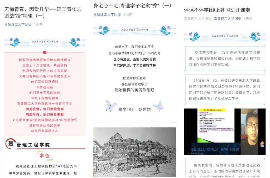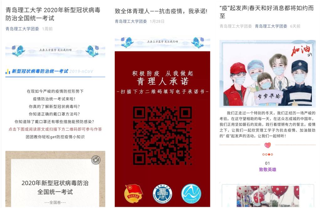 科学引导,理性应对疫情。积极开展疫情知识宣传和健康教育,不断创新宣传手段,坚决遏制谣言扩散。在校团委新媒体账号开辟“战‘疫’”系列专栏,打造“无悔青春,因爱升华”理工青年志愿战“疫”特辑系列,设置“身宅心不宅 停课不停学”、“疫”起发声、社团战“疫”等板块。第一时间发布《致全体青理人——抗击疫情,我承诺》承诺书,并制作“新型冠状病毒防治知识问答”H5,吸引近10000名团员青年参与网络答题、承诺接力。截至目前,校团委各类新媒体账号发布疫情防控相关推送76篇,有效提升学生网络媒介素养,引导学生理性对待疫情、科学防控疫情,不信谣、不传谣,积极践行网络文明道德。