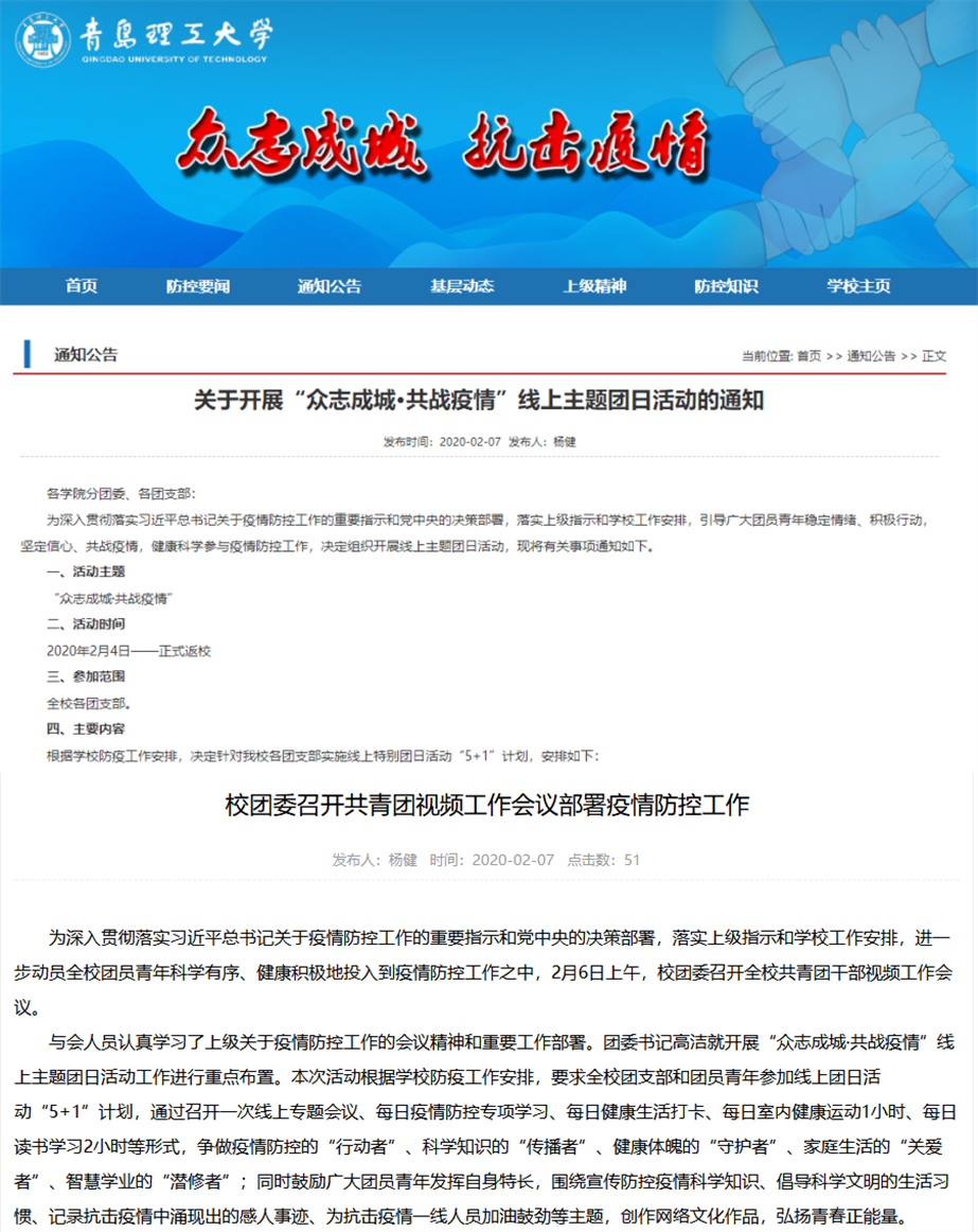 疫情就是命令,防控就是责任。校团委将充分利用疫情防控这一特殊时期、特殊情境,进一步加强团员青年思想政治教育,强化思想引领,把握正确导向,提升育人效果,充分展现党的助手和后备军的担当,充分展现青年生力军和突击队的作为,为坚决打赢疫情防控阻击战贡献力量。(撰稿:曲乐;审核:高洁)