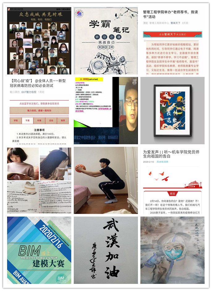 发挥作用,彰显青年担当。疫情当前,使命在肩。一批批优秀的返乡理工青年,积极响应上级团组织的号召,在做好自身防护的前提下,为当地疫情防控工作贡献青春力量,用实际行动彰显理工青年的责任与担当。各分团委结合专业特色和学院实际,开展形式多样的集思想性、教育性、知识性、生活性于一体的活动,带领坚守在家的团员青年们积极抗“疫”。学生们纷纷拿起手中的笔纸、架起手机与相机,用生动的图画、深情的文字、悠扬的歌声、有力的舞姿,用自己的实际行动,传达最真挚的祝福,唱响最嘹亮的赞歌,用别样的方式,凝心聚力,共渡难关。此外,校团委积极引导广大青年团员充分利用居家时间不断充实自我,制定学习计划,保持健康作息时间,“停课不停学”,为疫情防控做出自己独特的贡献。