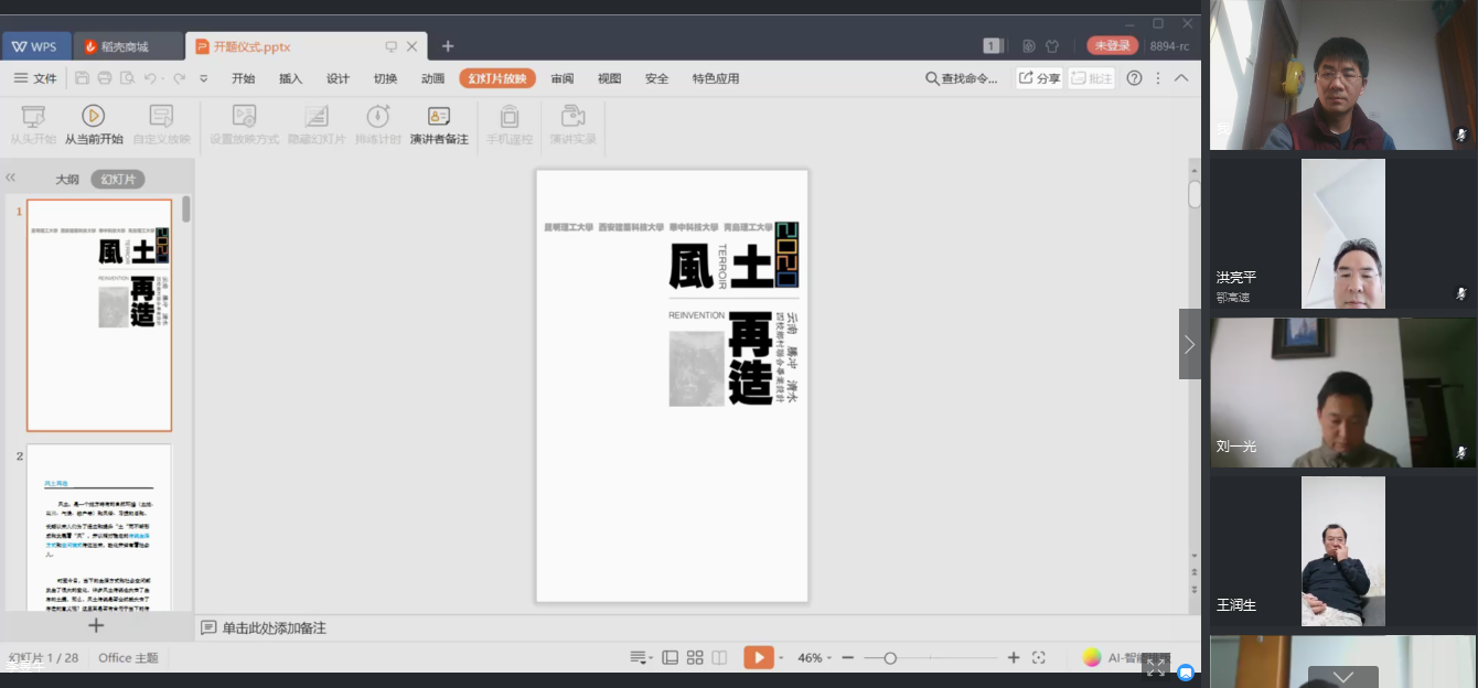 今年的联合毕业设计由昆明理工大学负责组织,昆明理工大学建筑与城市规划学院副院长杨毅教授作了热情洋溢的开题致辞,介绍了云南、腾冲的地域特色及乡村特点。随后,西安建筑科技大学段德罡教授、华中科技大学洪亮平教授以及我校王润生教授作为各校教师代表发言致辞,老师们表达了对本次联合毕业设计题目的见解与意见,并向武汉的老师同学们致以诚挚的关心问候。接下来由四校学生代表对各校参与的团队成员进行介绍,我院由郭清雅同学作为学生代表发言,同时表达了对本次联合毕业设计活动的期待。