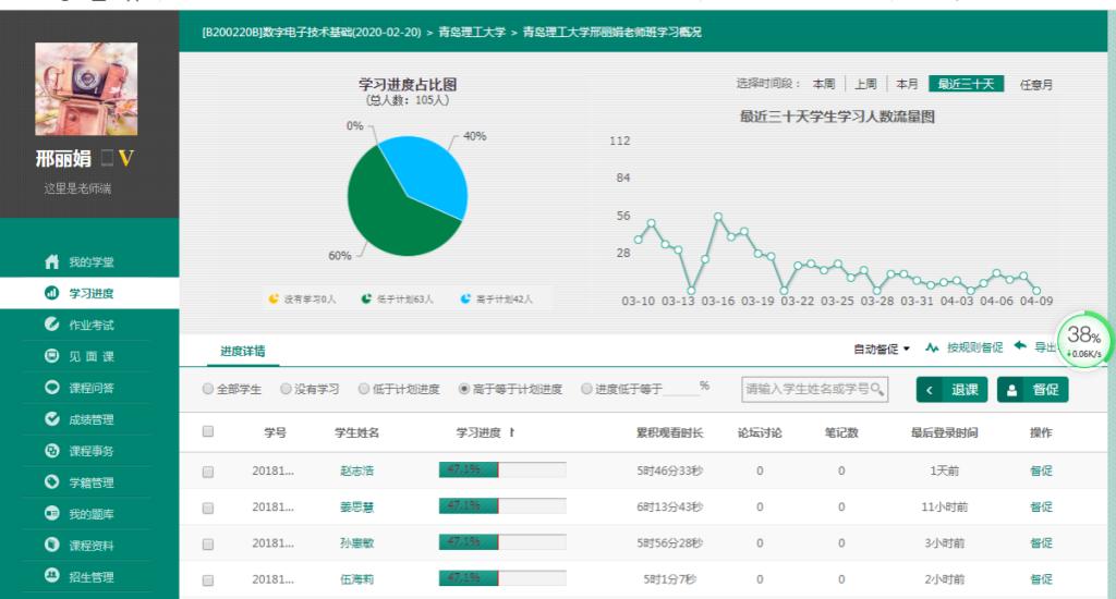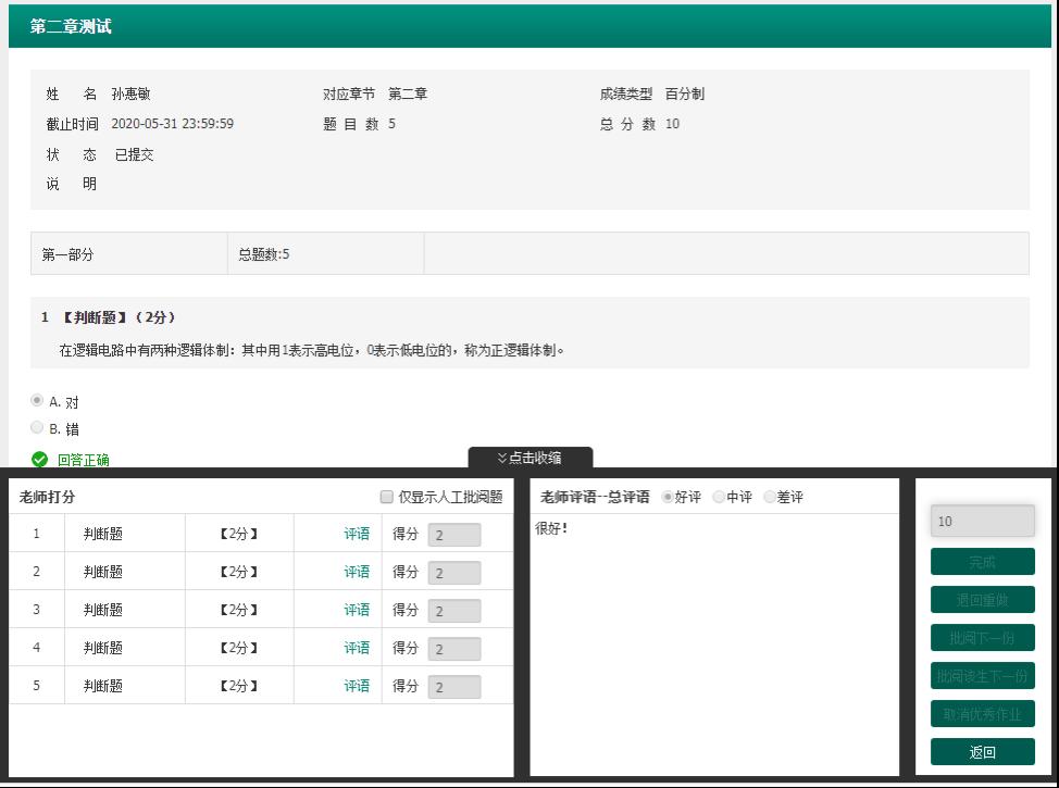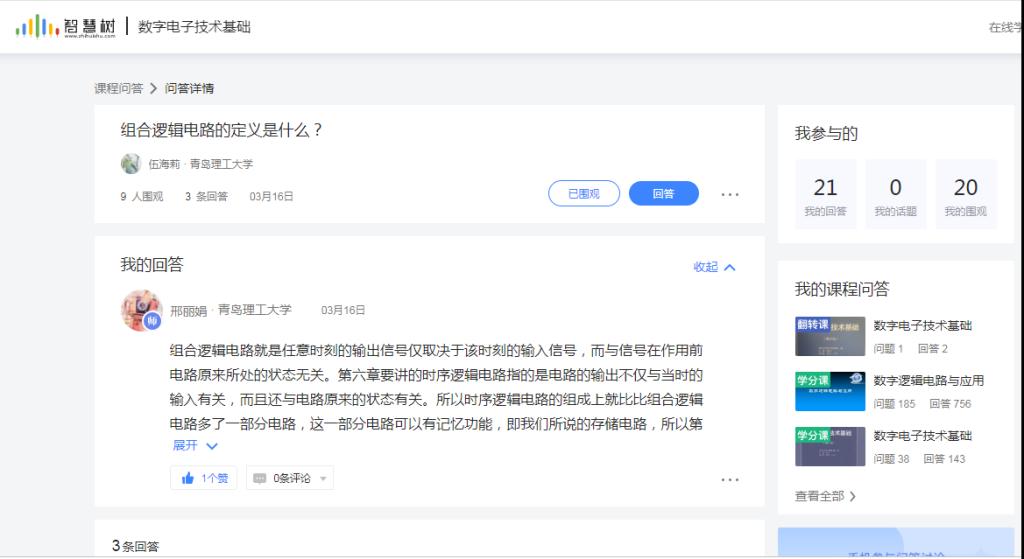 在线教学前,我和课程组的几位任课老师已经共同搭建了基于智慧树共享平台的《数字电子技术基础》课程资源,为用智慧树平台作为学生的预习平台奠定了基础。学生通过智慧树平台观看各章节重要知识点的视频,完成简单的章节测试,使学生对重要知识点有个初步认识。在预习环节中学生主动学习、积极参与,通过自学、查阅相关资料,带着问题参加线上学习。另外,智慧树平台也提供课程问答的功能,学生们在预习结束后会提出各种各样的问题,通过师生之间、生生之间的问题解答,达到了比较好的预习效果。每次授课前,我会查看学生们做的章节测试情况,针对测试中出现错题的情况,授课时有重点地去讲解对知识点的理解错误之处,更能加深学生对这部分知识的理解和掌握。