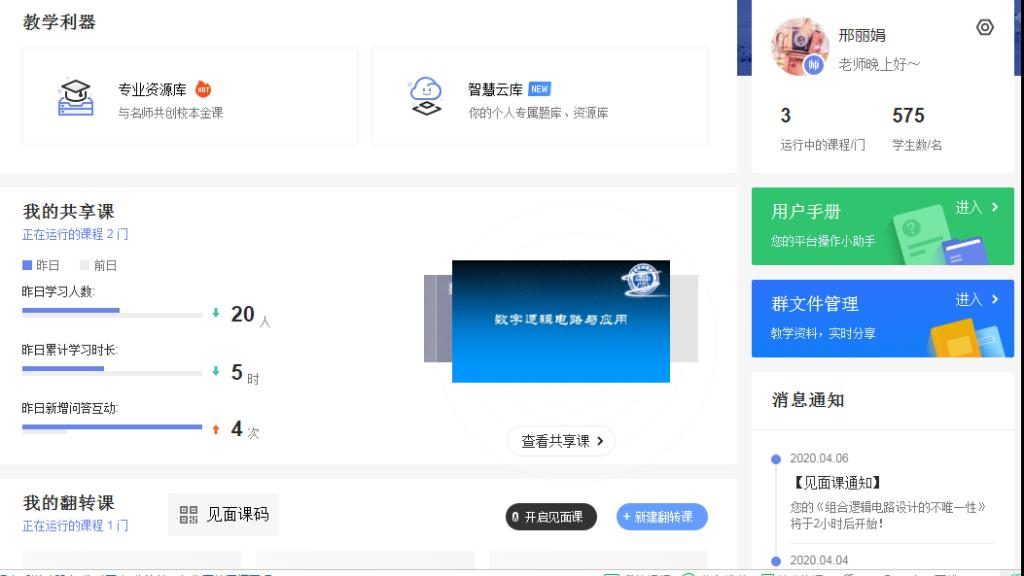 《数字电子技术基础》课程的特点是有大量的电路描述和习题讲解,直播平台需要有较强的互动教学功能,经过权衡对比以及与学院其他老师的交流,最终采用“腾讯课堂+智慧树平台+QQ课程群”的授课方式,充分利用各平台的优势。利用腾讯课堂强大的直播互动功能进行在线教学,根据智慧树提供的丰富资源和便于作业考评管理的优势,将其作为课程预习和布置作业、提交作业的平台。为应对直播时腾讯课堂可能发生的问题,将智慧树翻转课堂作为腾讯直播课堂的备用课堂。前期在线辅导过程中已建立QQ课程群,为随时解答学生疑问、及时发布信息提供了方便。在线教学继续利用QQ课程群作为师生快捷互动的交流工具,完成提供学习资料(课件、电子版教材、拍照作业答案)、随时互动答疑、及时发布消息等功能。
