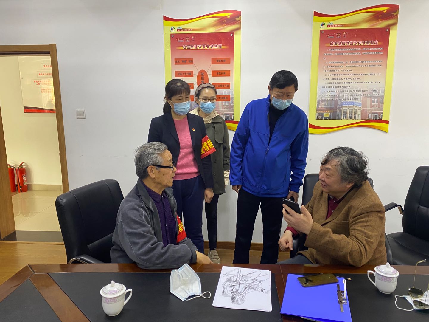 社区治理处在国家治理和社会治理的最末端,也是距离人民群众最近的治理单元。为进一步提升社区治理工作科学化、精细化和组织化水平,畅通服务人民群众“最后一米”通道,工作组发挥高校智力优势,主动搭建平台,4月8日,青岛理工大学党委常委、副校长于德湖带领社会工作专家团队来到社区举办社区治理现代化研讨会,分享学校的科研资源,共同为城市治理、社区治理出谋划策,解决社区工作中的难点、堵点和痛点问题。工作组请来青岛理工大学广告学专业团队为社区制作宣传片,讲述最美社区故事;请来法律专业杨奎臣老师给社区居民做普法宣传,构建和谐社区;请来艺术与设计学院擅长画老兵的王伟业副教授,为“老兵服务社”的75岁党员杨希岗画肖像,用画笔记录下老兵志愿者们抗击疫情的动人瞬间,讴歌他们身上体现出的大爱精神。