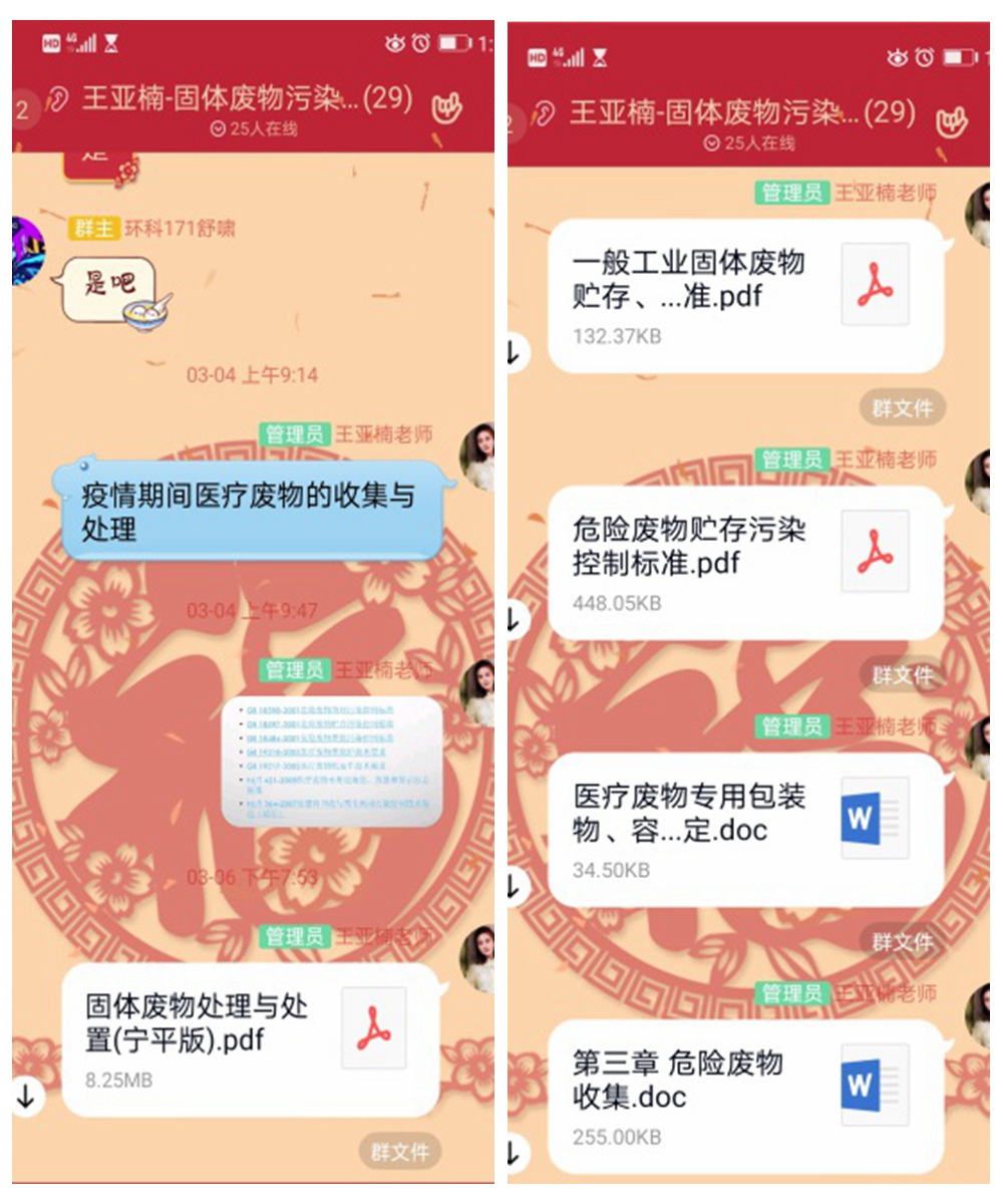 主干课程组建课程团队,由课程团队负责人统一安排授课。如《固体废弃物处理与处置》课程由孙英杰教授牵头,授课团队包括六位青年老师,主要采用QQ视频-屏幕分享、腾讯会议等方式授课。为激发学生对在线课程的学习兴趣,调动课堂气氛,授课过程中采用案例与讲授相结合的方式,将知识点与日常工业、生活中的相关案例结合进行讲解,让课堂讲授通俗易懂。