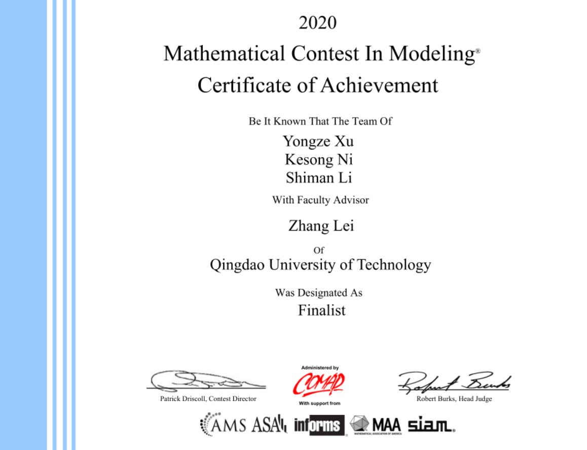 2月14日至2月17日、3月6日至3月10日美赛由于受新冠病毒疫情影响分成两个比赛周,参赛队员们克服困难,充分利用网络昼夜奋战了48个小时,就指定的问题完成从建立数学模型、运用各种数学方法以及计算机技术进行求解,验证模型的合理性,并利用所建立的数学模型的结果给相关部门提出合理化建议,最终提交出结构清晰、结论明确的英文论文。通过这项国际比赛我校学子有机会与全球著名高校的优秀学生同场竞技,激发了我校学生的竞争意识和团队协作精神,提高了学生的创新能力和综合素质。我校学生能在世界舞台上脱颖而出,展现青岛理工大学学子的风采,是建模指导团队全体老师与参赛学生辛苦付出、团队合作的结果,更是与学校领导、职能部门等长期以来重视大学生科技创新能力的培养,努力培养高素质人才的教学理念密不可分的。
