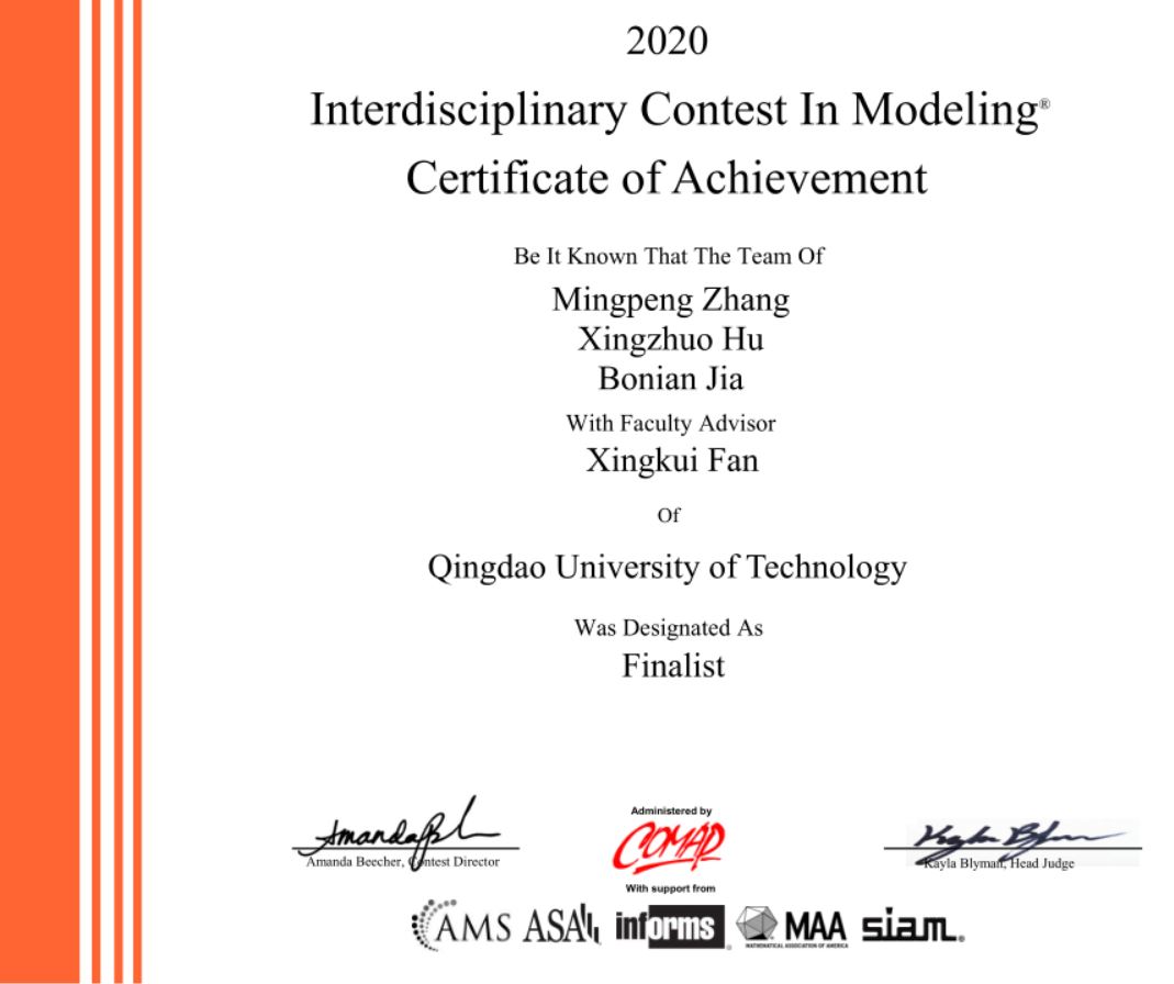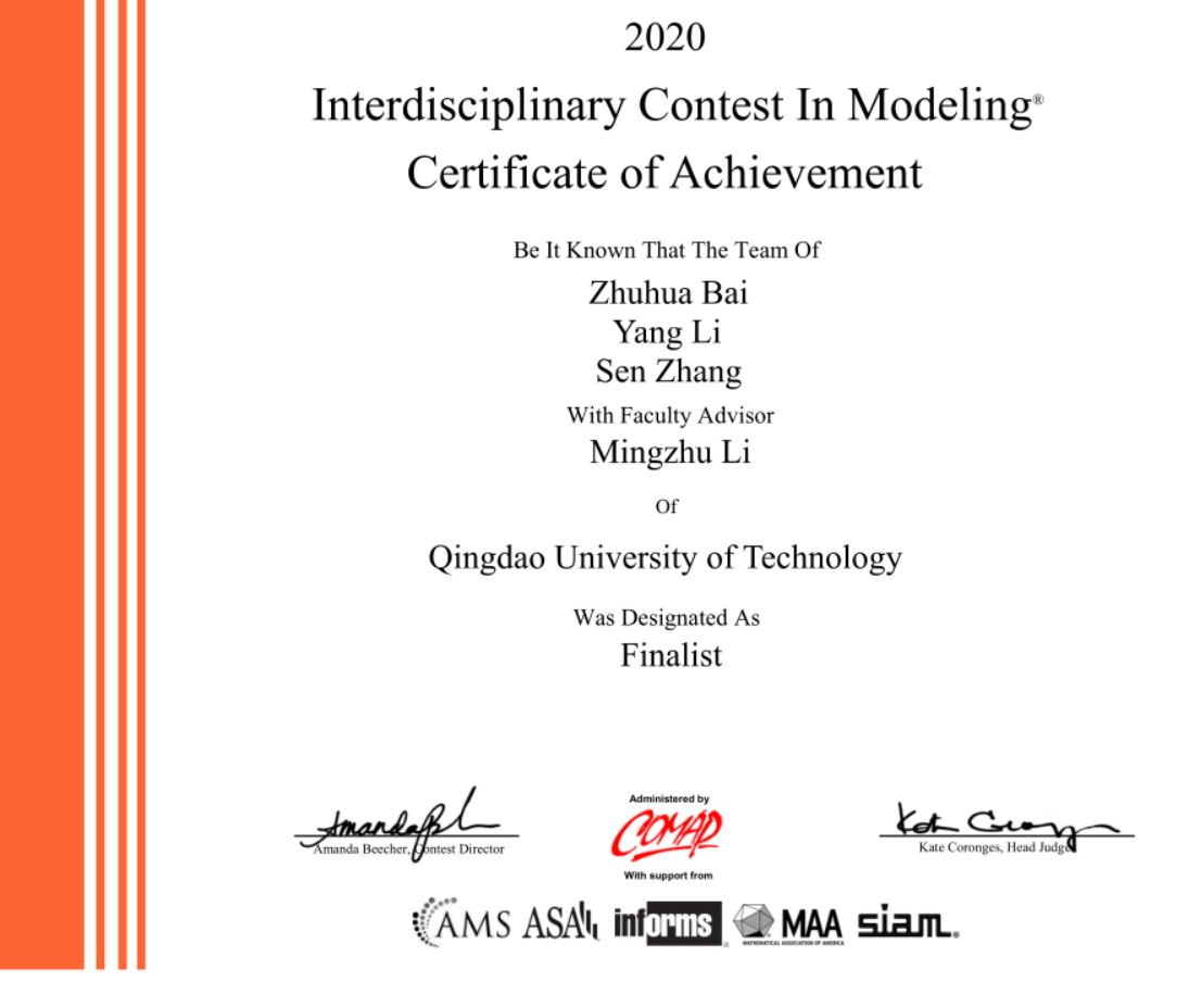 4月27日,2020年美国国际大学生数学建模竞赛(MCM)与交叉学科建模竞赛(ICM)成绩揭晓,我校理学院数学建模指导组指导的63个参赛队喜获佳绩:获得美赛特等奖提名(Finalist)3项、美赛一等奖(Meritorious Winner)3项、美赛二等奖 (Honorable Mention)10项、美赛三等奖(Successfully Participation)47项!