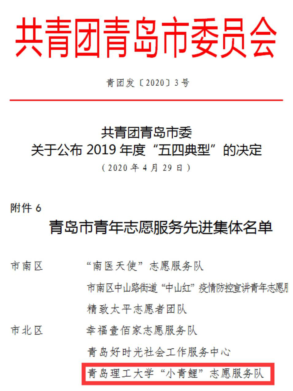日前,青岛团市委下发《关于公布2019年度“五四典型”的决定》,我校“小青鲤”志愿服务队荣获“2019年度青岛市青年志愿服务先进集体”荣誉称号。