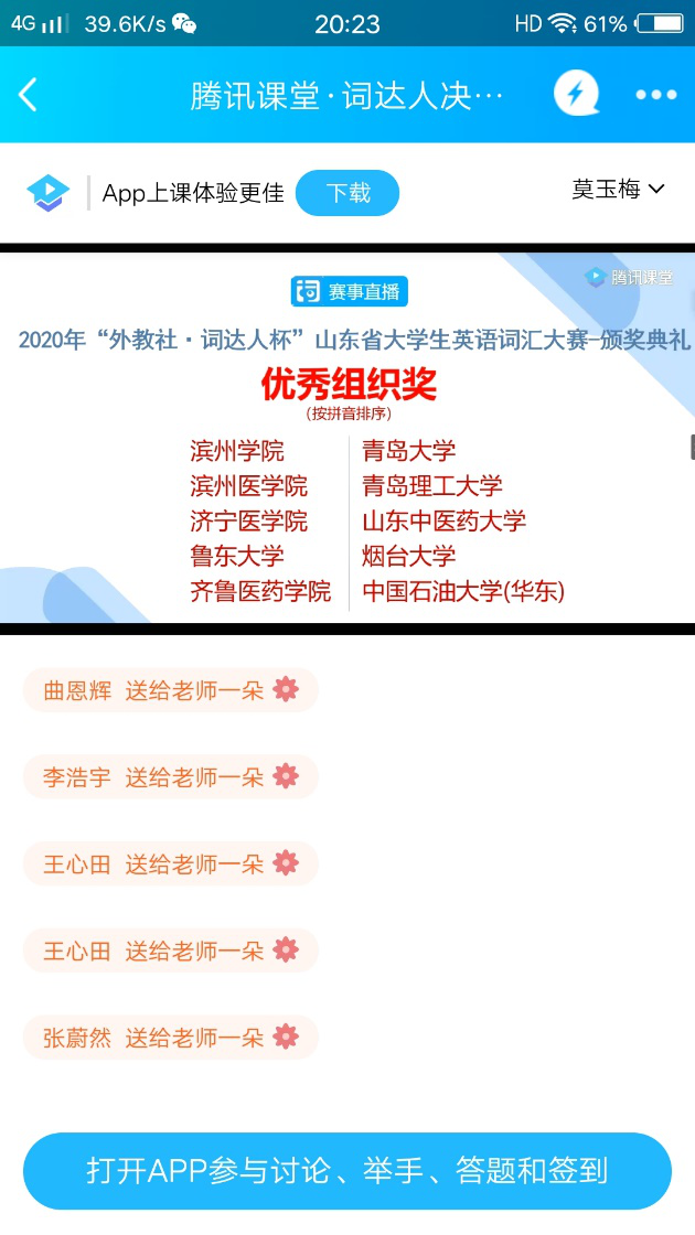 2020年“外教社•词达人杯”大学英语词汇大赛山东省决赛于5月30日举行,共有来自65所高校的1218位非英语专业学生参赛。经过校内初赛、复赛,我校共选出20位学生参与决赛,同其他参赛选手齐聚“词达人”平台云端赛场,同台竞技。