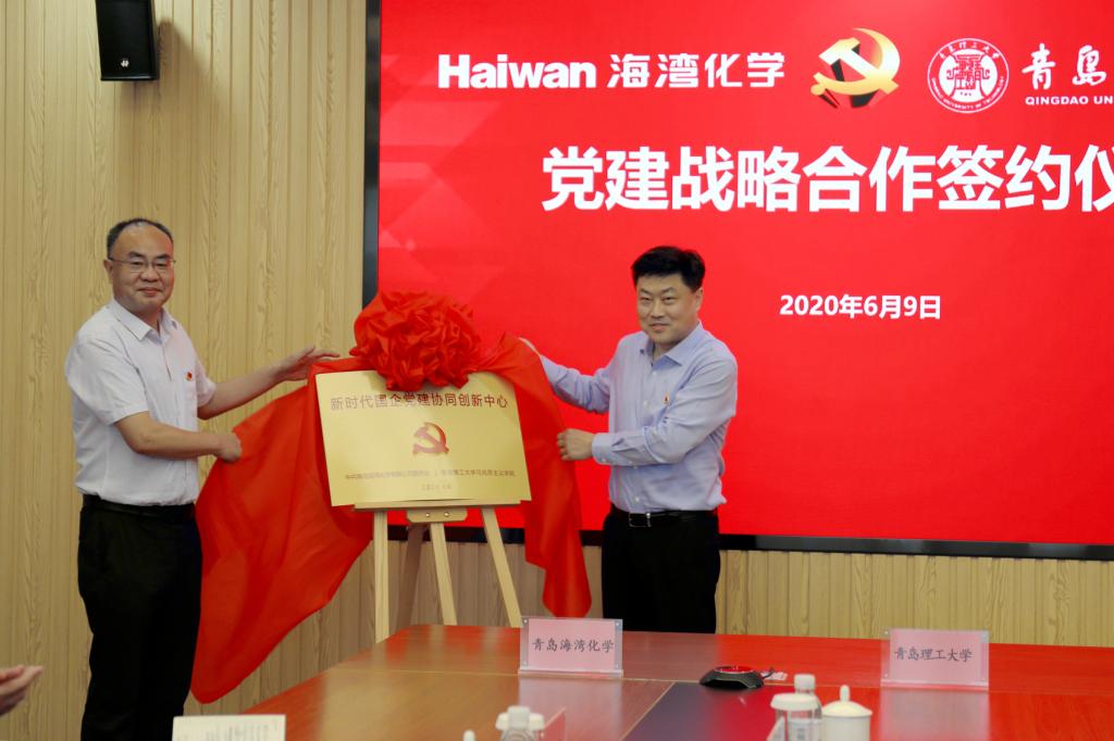 仪式上,青岛海湾化学有限公司党委书记、董事长邹铁军,学校党委常委、党委宣传部部长陈伟共同为“新时代国企党建协同创新中心”揭牌。青岛海湾化学有限公司党委副书记任新琛、学校马克思主义学院党总支书记王菁华共同签署党建战略合作协议。青岛海湾化学有限公司相关负责人、马克思主义学院部分教师参加仪式。