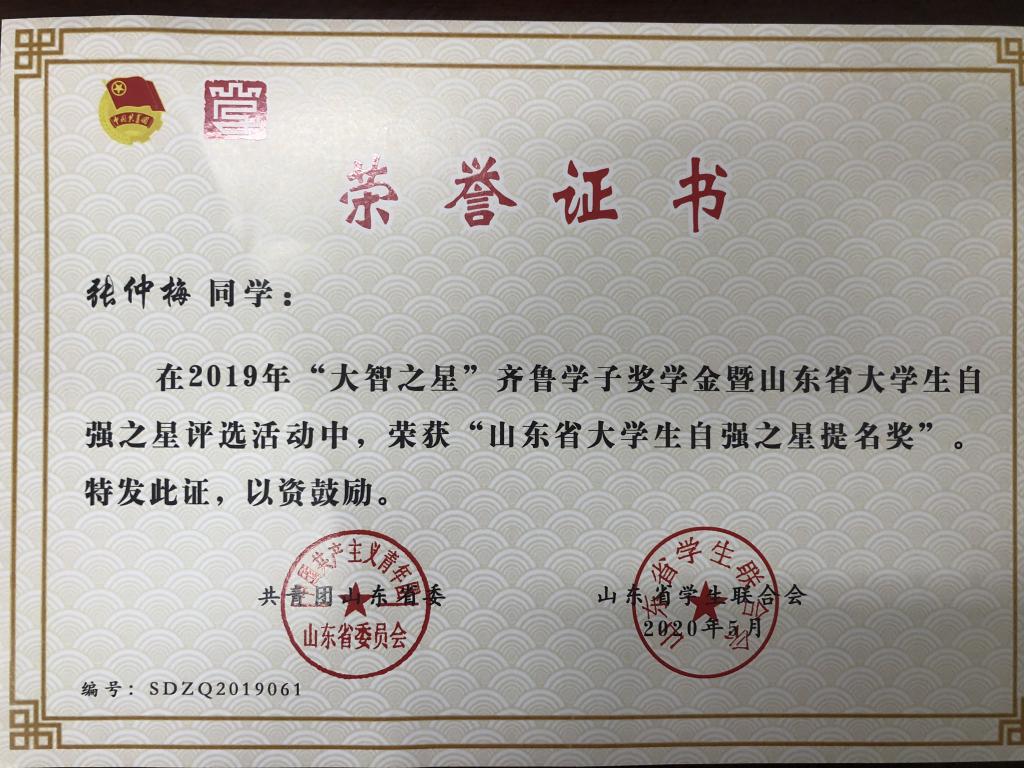 近日,由团省委、省学联、大智教育集团联合开展的2019年“大智之星”齐鲁学子奖学金暨山东省大学生自强之星评选结果揭晓。我校丁佳艺同学荣获大学组·榜样奖暨山东省“大学生自强之星标兵”(山东省仅评选10名),张仲梅同学荣获大学组·提名奖暨山东省“大学生自强之星”提名奖。