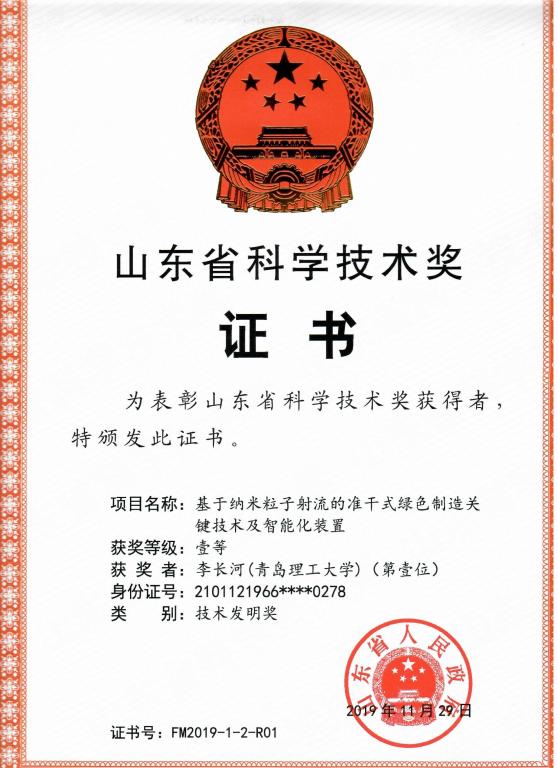 “基于纳米粒子射流的准干式绿色制造关键技术及智能化装置”项目围绕少无切削油液的准干式制造技术,在国内外率先发明了可降解基础油及纳米流体制备关键技术,揭示了刀具/工件约束空间流场分布规律,首次发明了荷电纳米流体微液滴多能场驱动可控输运新方法与智能装备,解决了纳米流体减量化精准供给和微液滴飘散飞逸的技术难题,填补了国内外空白,首次发明了纳米流体热物理特性测试新原理与微液滴密度谱检测新技术,率先揭示了高压高速射流条件下,纳米粒子与携带流体介质微/纳界面热交换本质及其换热能力影响规律,构建了准干式制造工艺体系,解决了航空航天和轨道交通等领域难加工材料的准干式高效加工难题,降低冷却液使用量90%以上、使用成本75%以上。该项目项目获得授权发明专利110项,其中美国、澳大利亚等国外发明专利5项,中国发明专利105项;其他知识产权88项。2项专利分别获得山东省专利一等奖和中国循环经济协会专利金奖、2项入选山东省和青岛市高价值专利、16项已转让、4项已许可产业化。制定了准干式切削仅有2项国家标准,出版著作6部,发表SCI/EI论文130余篇(其中JCR1区24篇、机械工程学报13篇),ESI高被引论文3篇,总被引1700余次。得到Zhang L. C院士和国际磨料技术委员会主席徐西鹏教授的正面评价。研究成果获得中国机械工业科学技术奖、中国石油化学工业联合会技术发明奖、中国产学研合作创新成果奖。项目团队在卢秉恒院士的指导下培养了教育部新世纪优秀人才、长江学者奖励计划青年学者、泰山学者特聘专家、山东优秀发明家等高层次人才。技术在中国中车、中国铝业、西南航空等国内800多家制造企业推广应用,构筑了微量润滑基础油制备、多能场智能可控输运、纳米流体热物性检测、准干式制造工艺体系产业链专利群,解决了准干式绿色制造共性关键技术难题;典型应用单位创造效益20.7亿,近三年新增销售额5亿、新增利税0.88亿,取得了显著经济效益和重大社会效益。