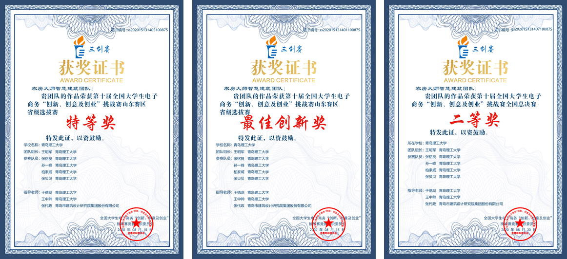 近日,由教育部主管、全国电子商务创新产教联盟主办的第十届全国大学生电子商务“创新、创意及创业”挑战赛(简称“三创赛”)总决赛在河南科技大学落下帷幕。我校土木工程学院“农房大师智慧建设团队”,从全国65000余只参赛团队中脱颖而出,一举斩获本届“三创赛”山东省特等奖、最佳创新奖以及全国总决赛二等奖。