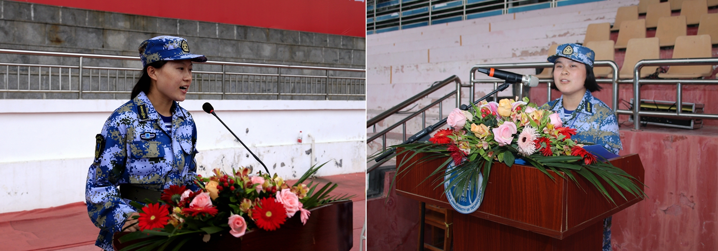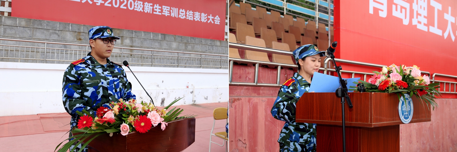 艺术与设计学院刘洋同学、管理工程学院姜欣同学作为军训学生教官代表发言,他们表示作为学校军训改革试点后的第一批学生教官,遵循“枕戈待旦迎挑战,厉兵秣马新征程”的理念,时刻传承军人精神和军人作风,帮助2020级新生系好大学生活“第一粒扣子”。希望同学们坚定理想信念,培育高尚品格,勇于创新创造,不负青春,不负韶华,在矢志奋斗中谱写新时代的青春之歌。