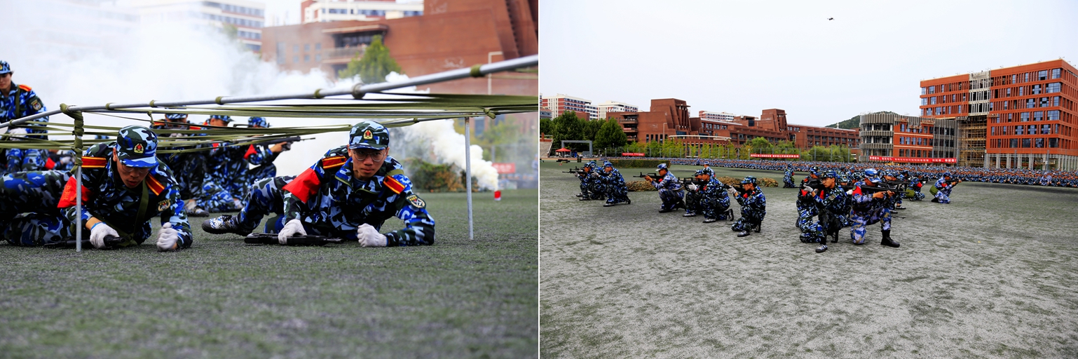本次军训汇演由传统的分列式+技能操演的汇报方式改为模拟对抗演练的汇报方式进行。演练中,同学们以攻防对抗为背景,融合了战伤救护、平原攻防以及战术基础动作等课目,卧倒、匍匐、跃进,各种战术动作一气呵成,展开战斗队形、正面猛攻、迂回包抄,各种攻击战法完美结合,整个过程迅速有序,硝烟味十足,展现了非同凡响的军人气质和青岛理工大学学生的精神面貌,赢得了全场的掌声与喝彩。除此之外,还有擒敌拳、战伤救护、武器分解、旗语、刺杀操、军体拳等表演项目。