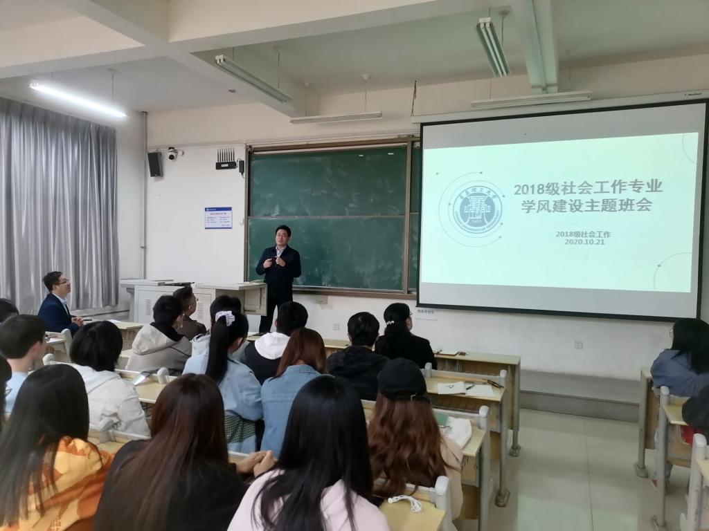 为贯彻落实学校的学风建设实施方案,进一步加强学风建设,将学院学工“三大工程”之土壤工程筑牢做实,10月21日下午,人文与外国语学院2018级社会工作专业在主教学楼B207召开“学风建设”主题班会,校党委常委、统战部部长王维、人文与外国语学院党总支书记王新、党总支副书记王振参加,会议由班主任杨书胜主持。