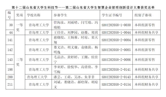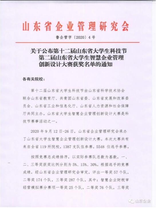 近日,由山东省企业管理研究会承办的山东省大学生智慧企业管理创新设计大赛举行,本次比赛是“第十二届山东省大学生科技节”赛事活动之一,共吸引了来自全省119所院校的1387支队伍参赛。我校商学院八支参赛队全部获奖,共斩获一等奖2项、二等奖6项。