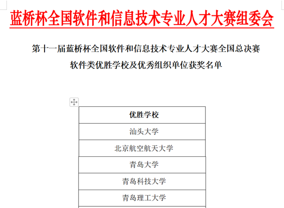 11月14日,第十一届“蓝桥杯”全国软件和信息技术专业人才大赛全国总决赛在全国600多个赛点成功举办,来自北京大学、清华大学、复旦大学、上海交通大学、北京航空航天大学和哈尔滨工业大学等高校在内的800余所高校的顶尖选手参加本次巅峰对决。我校信息与控制工程学院学生表现突出,荣获一等奖1项、二等奖7项、三等奖10项、优秀奖4项,我校被评为全国总决赛“软件类优秀组织单位”。