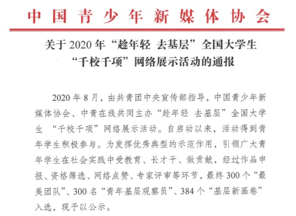 近日,由共青团中央宣传部指导,中国青少年新媒体协会、中青在线共同主办的“趁年轻 去基层”2020 年全国大学生“千校千项”网络展示结果公布,我校建筑与城乡规划学院筑梦红旗社会实践团队荣获“最美团队”称号,知行滕州实践调研团队宋臣作品入选“基层新画卷”。