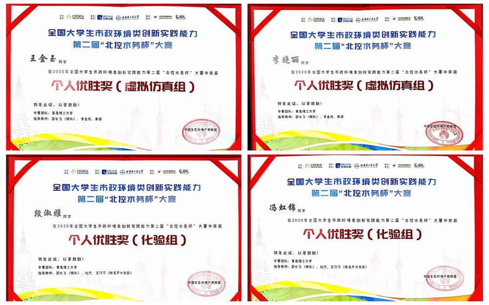 近日,全国大学生市政环境类创新实践能力第二届“北控水务杯”大赛落下帷幕,我校环境与市政工程学院学生在此次竞赛中取得优异成绩,荣获个人优胜奖4项。