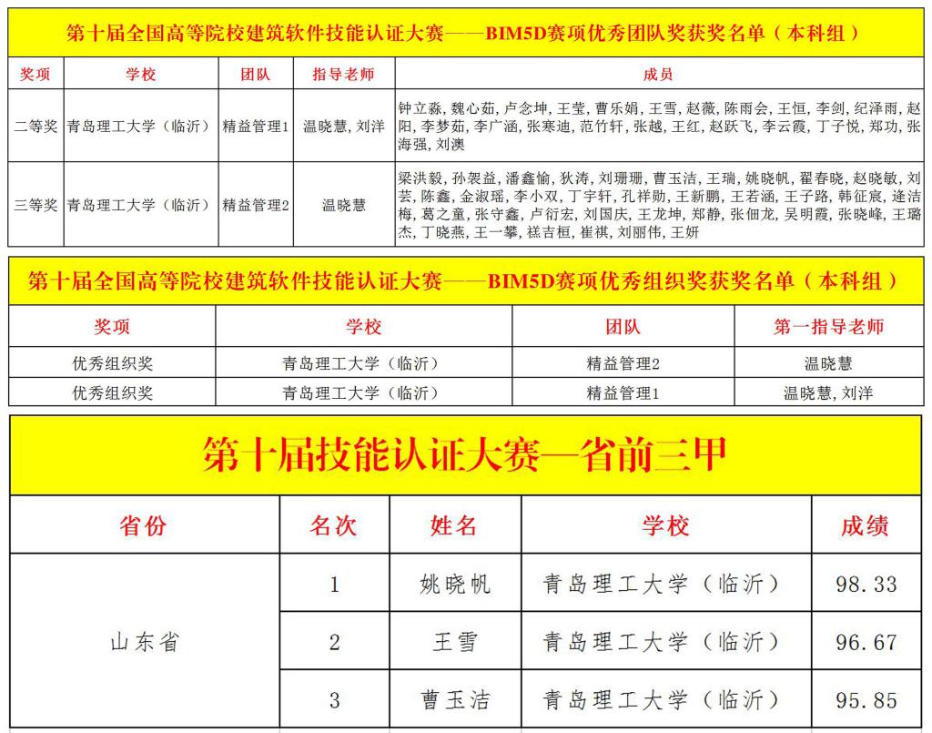 近日,由广联达科技股份有限公司举办的第十届全国高等院校建筑软件技能认证大赛BIM5D赛成绩揭晓,临沂校区选派的两支队伍斩获佳绩。