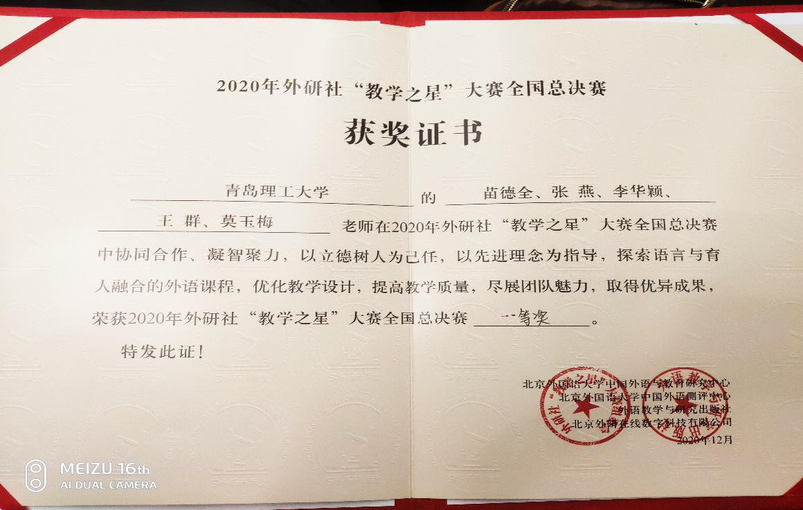 12月16日,2020年外研社“教学之星”大赛全国总决赛在北京顺利举行。人文与外国语学院大学英语教学比赛团队(苗德全、张燕、李华颖、王群、莫玉梅)努力拼搏,过关斩将,获得全国总决赛一等奖。这是我校大学英语教师在这一赛事中取得的最好成绩。