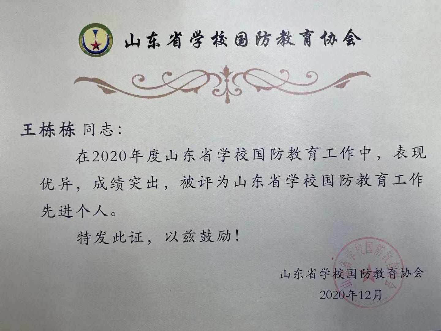 经各高校推荐,山东省学校国防教育协会评定,我校王栋栋、吕海青同志被评为“山东省学校国防教育工作先进个人”。