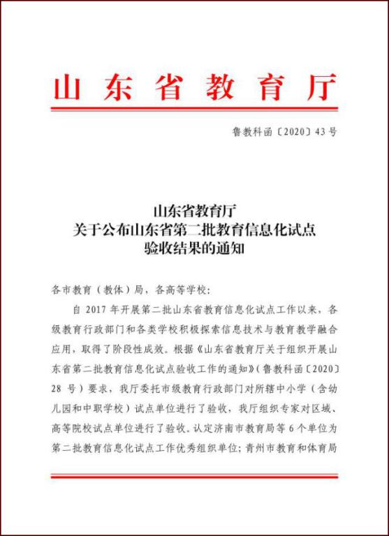 近日,山东省教育厅发文公布了第二批教育信息化试点验收结果,我校顺利通过了第二批教育信息化试点验收。