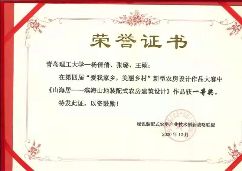 近日,第四届“爱我家乡,美丽乡村新型农房设计作品大赛”结果揭晓,我校建筑与城乡规划学院建筑学专业2019级研究生杨倩倩、张璐、王硕提交的作品《山海居——滨海山地装配式农房建筑设计》(指导教师:郝赤彪、解旭东)荣获一等奖。
