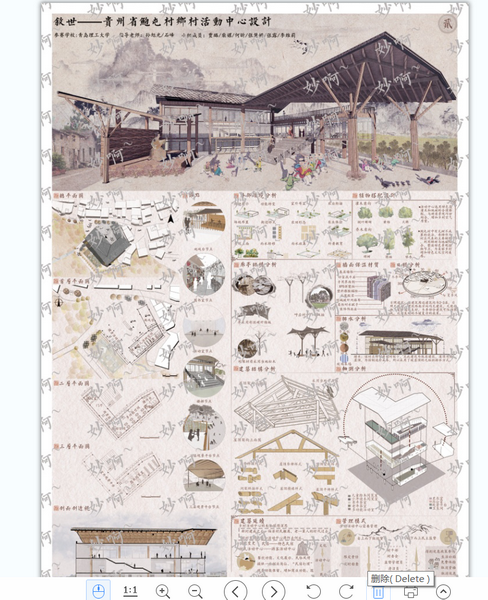 乡村设计方案竞赛单元优胜奖获奖作品《叙世》(作者:柴嫘、何昕、贾璐、李维莉、张慧娇、张露,指导老师:孙旭光、石峰)以中国传统村落—贵州省安顺市西秀区大西桥镇鲍家屯村为设计对象,从场地、人、建筑、活动四个方面和“凝聚”、“连结”、“延续”三个主题进行设计。提出“让活动空间凝聚村庄活力,联结人与自然,进而延续文明”的发展思路;元素提取方面,将传统的青石板、当地的樟木和柏木与现代化的玻璃、石灰等材质结合;管理模式和建筑延续上,采用自下而上的民主监督管理模式,旨在使村民得到更多的生活补贴、免费体验,增强对村庄的建设,提高自身荣誉感以及更多的集体存在感。