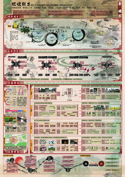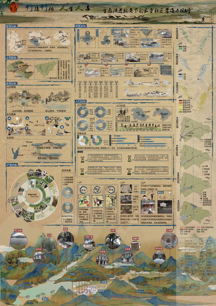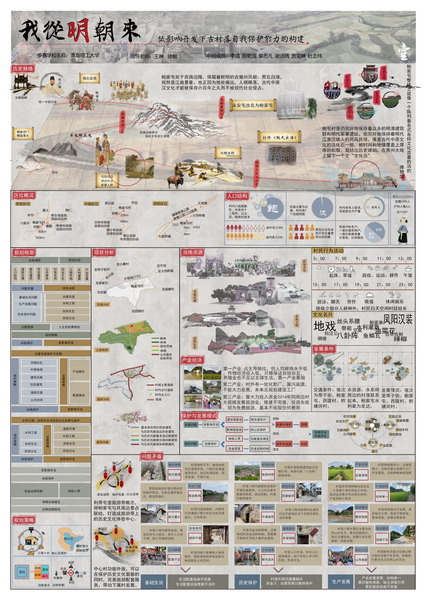 乡村规划方案竞赛单元佳作奖获奖作品《我从明朝来》(作者:李靖、章思凡、杜志伟、邢爱国、谢语嫣、贾雯琳,指导老师:王琳 徐敏)旨在通过对明代江淮文化和明代屯军文化结合体——鲍家屯进行规划,更好地体现屯堡文化的多样风貌。村落仍完好地保存着众多的明清建筑群和明代军事遗址,也完好地保持着明代江淮汉族人的民风民俗,像是古代中原文化的活化石一般,被时间和地缘覆盖上厚厚的松脂,凝结出历史琥珀,在贵州大地上留下一个文“文化岛”。团队希望通过最低影响开发手段,建立一个合理的古村落自生自建机制,使屯堡文化博物馆能够保持自养,在当下村落与自然和谐共生的环境中,最大程度保留鲍家屯物质文化风貌和精神生活风貌的原样。