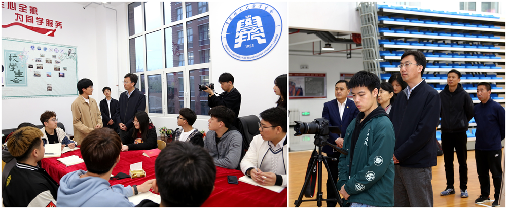 调研期间,尚胜波一行前往位于中央院系区和东区学生公寓的学生活动中心,与正在开展各类活动的同学们亲切交流。在校学生会办公室、大学生创业孵化基地、机械与汽车工程学院科技创新实验室、小鼎工作室等地,进一步了解了学生会改革、学校校园文化、科技创新、新媒体建设等情况。尚胜波一行还参观了位于风雨操场的《美术经典中的党史》展览,观摩马院教师对基层团支部的学习指导,了解我校组织化、网络化开展团员青年“学党史、强信念、跟党走”党史学习教育的实施情况。