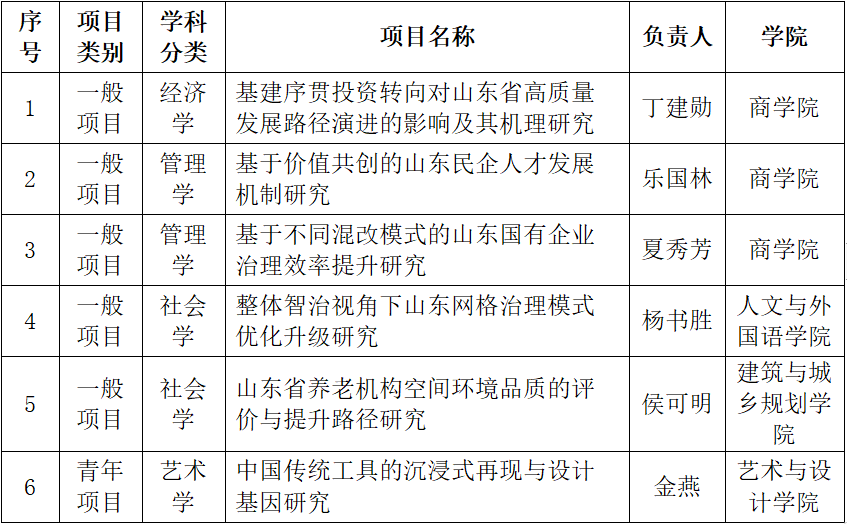 近日,按照《山东省社会科学规划项目评审立项办法》要求,经过初评、评审组独立审阅、民主讨论、投票表决、公示等环节,山东省哲学社会科学办公室公布了“2021年度山东省社科规划研究项目立项名单”,我校获批6项。