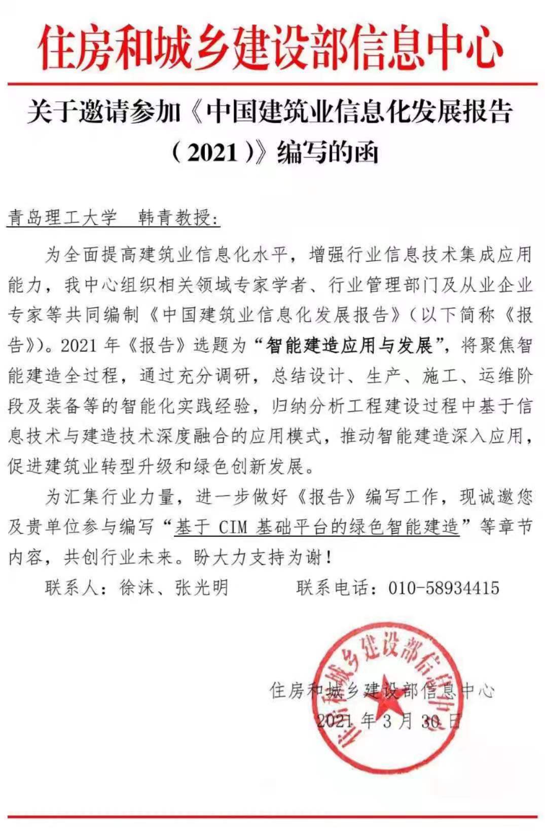 韩青教授将根据自己在CIM基础平台方面积累的经验,在《中国建筑业信息化发展报告(2021)》中“基于 CIM 基础平台的绿色智能建造” 等章节部分进行编写工作。韩青教授始终在科研上保持先进性与积极性,多次参加了国家、省部级研究课题,韩青教授在CIM方面有着自己多年积累的经验和见解,并在此领域有所突破。本次《中国建筑业信息化发展报告(2021)》的受邀编写就是对韩青教授平日对学术科研孜孜不倦钻研的肯定。住建部《中国建设信息化》在2021年最新一期已经刊登韩青教授为主编写的《青岛市城市基础模型(CIM)平台建设》一文。
