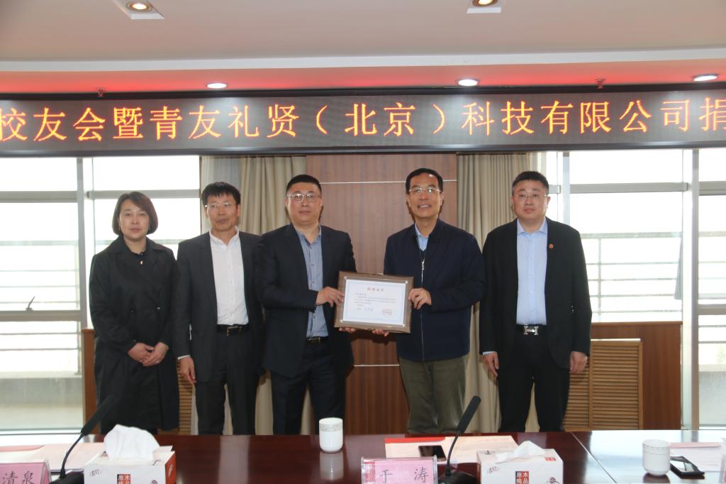 4月19日,北京校友会暨青友礼贤(北京)科技有限公司捐赠仪式在科技楼1908会议室举行。北京校友会副会长兼秘书长、中奥投体育发展有限公司副总裁于涛,北京校友会副会长、中汇博恩(北京)科技有限公司董事长,青友礼贤(北京)科技有限公司执行总裁方俊彦,北京校友会副会长、邦杰兴投资公司总经理,青友礼贤(北京)科技有限公司总经理李清泉等一行5人来校,向学校捐赠校园绿化专项资金。